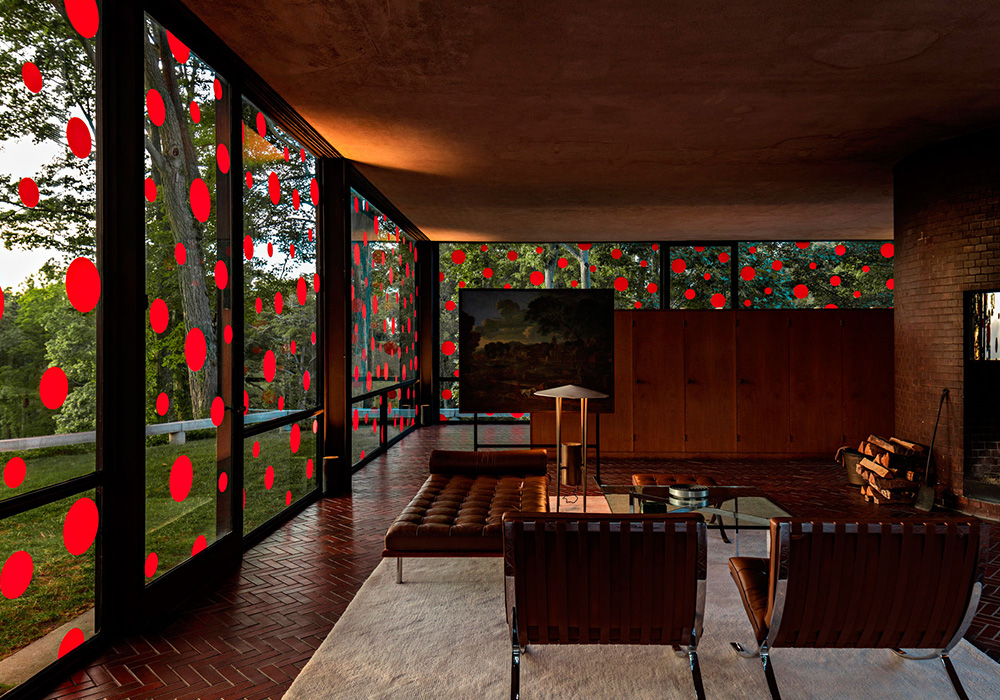 YAYOI KUSAMA DOTS PHILIP JOHNSON’S GLASS HOUSE IN A RED POLKA PATTERN