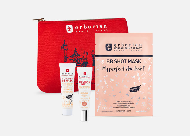 Небольшой набор с продуктами для создания ровного тона лица с максимально естественным эффектом. В красную косметичку вошли тканевая маска, которую можно использовать еще до отпуска — в самолете, восстанавливающая ночная маска для увлажнения и восстановления кожи, а также BB-крем.