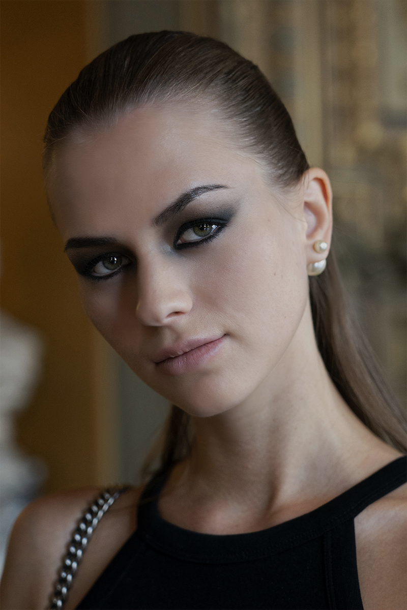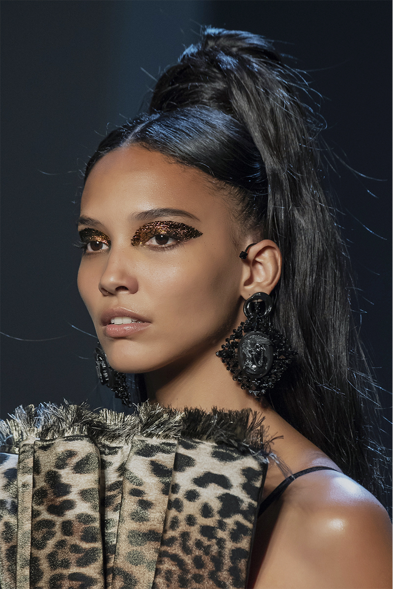Еще один красивый образ создала визажист Эрин Парсонс для Jean Paul Gaultier. Она сделала смоки с помощью дуохромных блесток, которые вытянула на виски.
