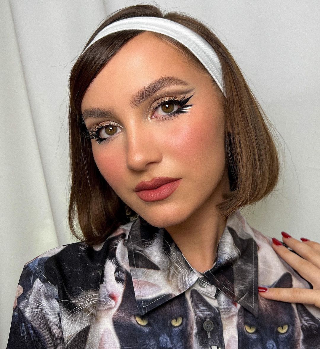 В 60-е кожу старались сделать матовой и напудренной. Но сейчас это необязательно: сочетайте тренды из разных эпох. Черные ретрострелки сочетайте с голографическими и переливающимися тенями и сияющей, «влажной» кожей.