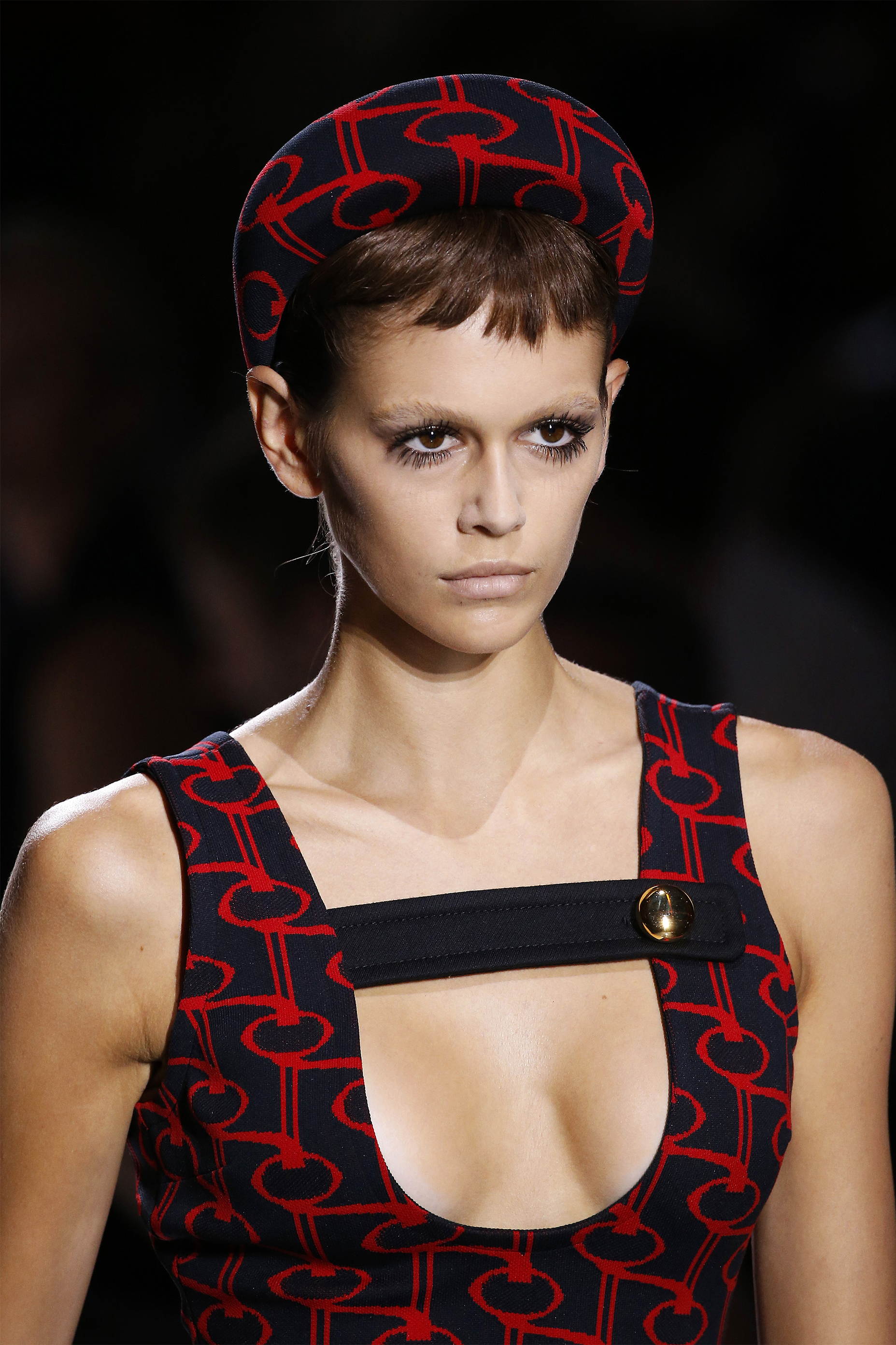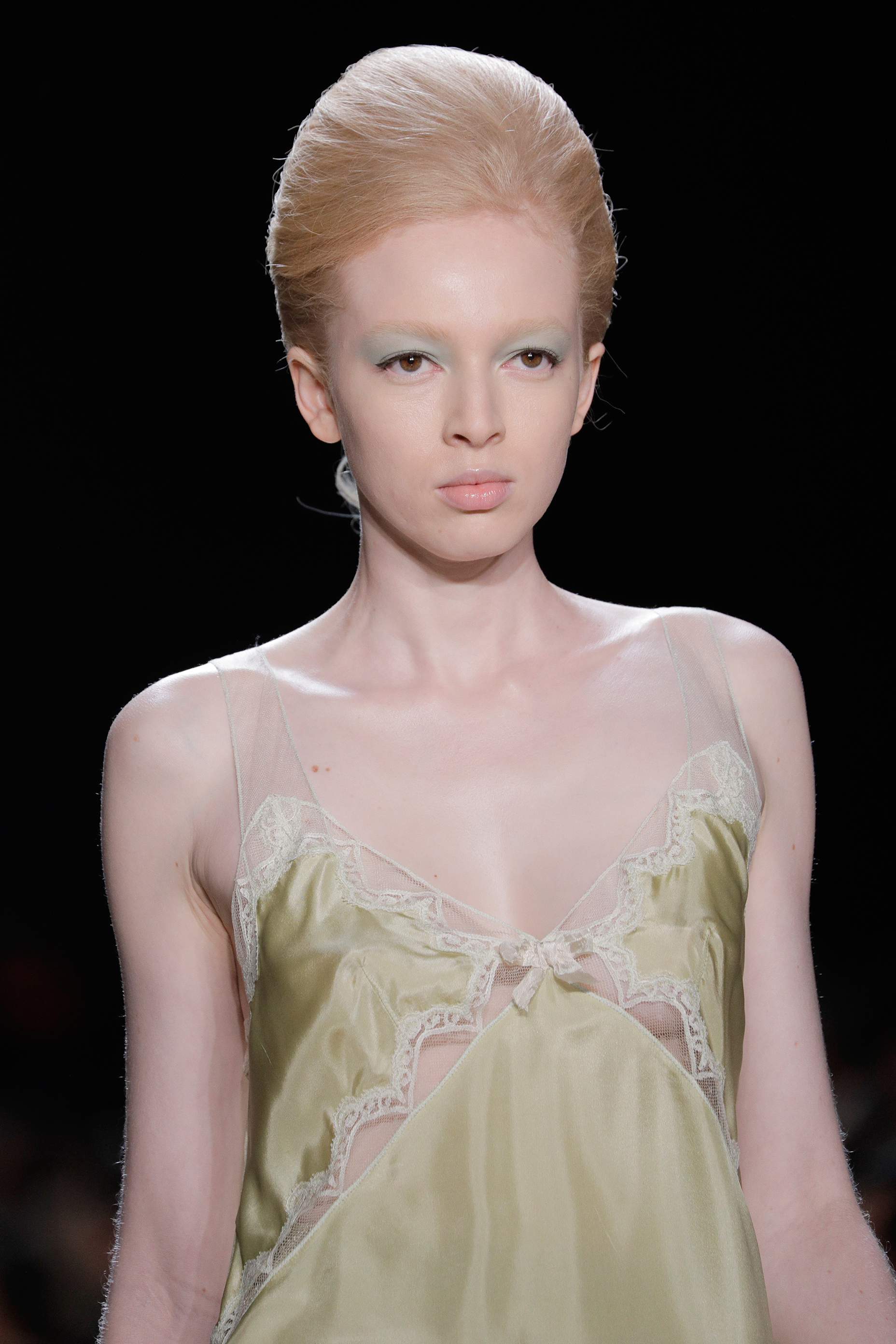 Уложенные в объемную прическу светлые волосы и жирно прокрашенные ресницы —трибьют роскошной Бриджит Бардо.