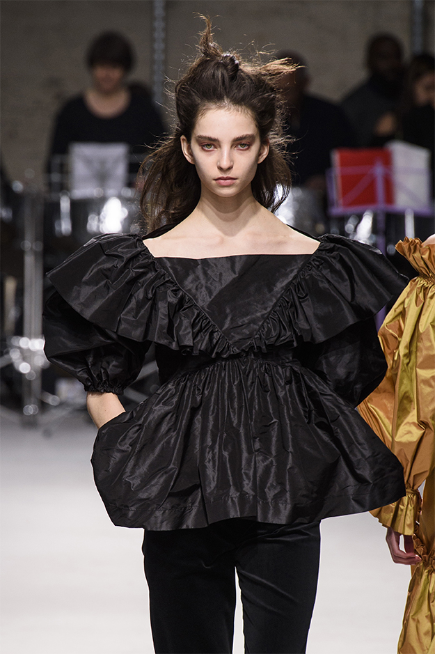 В противовес slicked back было представлено много вариантов объемных укладок. Волосы были полностью собраны наверх и предварительно накручены на показе Lauren Audrey (хоть это и парик), а на шоу Isa Arfen была заколота только верхняя часть волос. Наиболее интересная идея, сочетающая в себе два тренда одновременно, — зализанные укладки с объемными пушистыми хвостами с показа Sadie Williams.