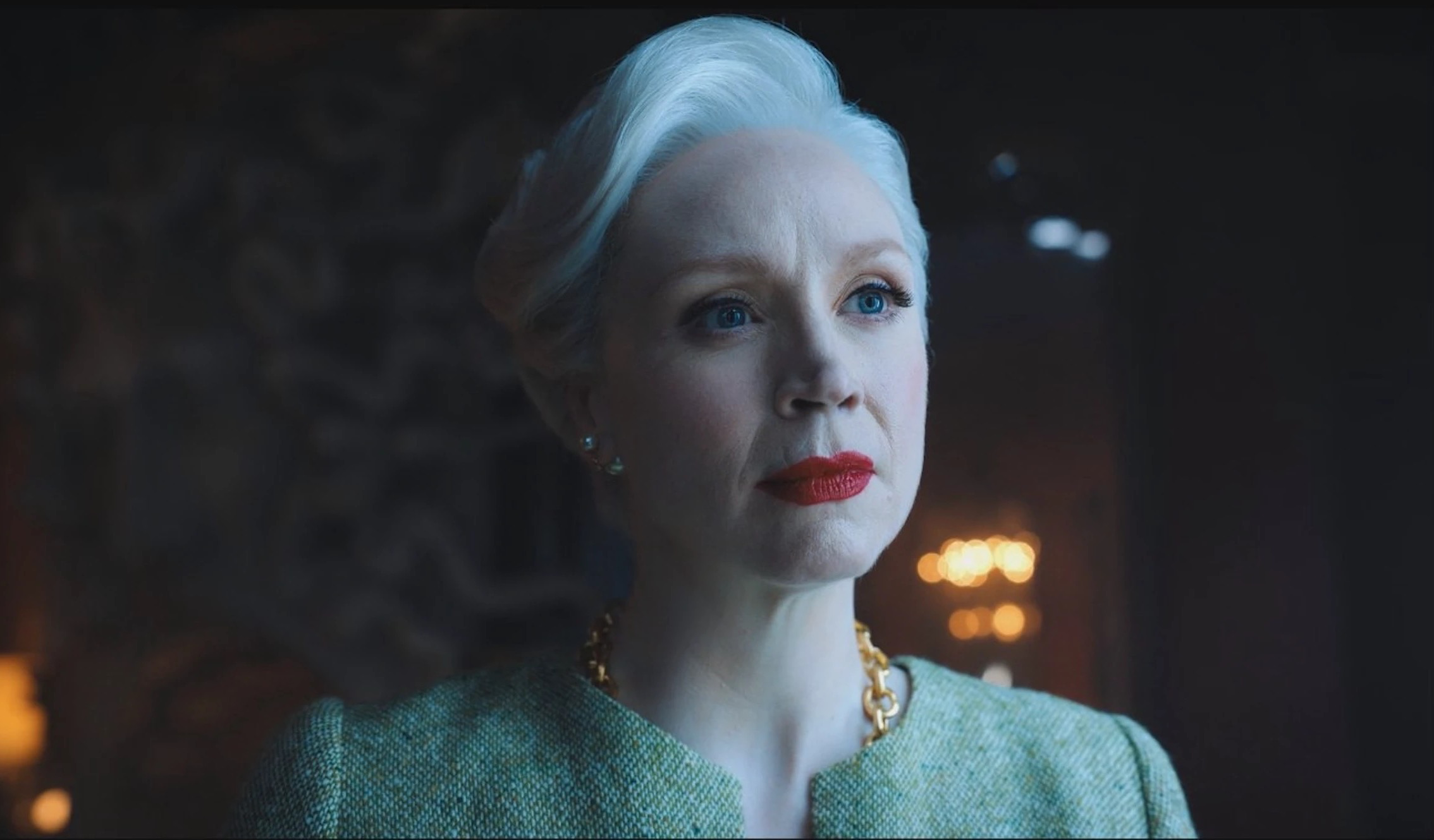 Отдельного внимания заслуживают образы и других героинь. Внешний вид директрисы Nevermore в исполнении Гвендолин Кристи был списан с культового образа Ким Новак в «Головокружении» Хичкока. А на лица сирен хайлайтер наносили с помощью специального трафарета в виде чешуи, а для глаз не жалели жидких теней с металлическим эффектом.