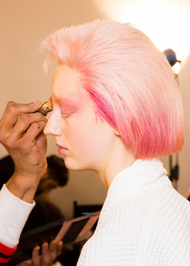 Для показа MSGM визажист Ребекка Баттерворт выбрала гипертрофированно длинные ресницы. Для нарочито небрежного эффекта она использовала очень много праймера для ресниц и еще больше черной туши в много слоев. А вот ресницы моделей с шоу Emilio Pucci были раскрашены в электрические оттенки розового, зеленого, оранжевого, голубого и нейтральный белый. Для этого стилисты поверх туши нанесли пигменты, разведенные специальной базой Mixing Medium Water Base от M.A.C.