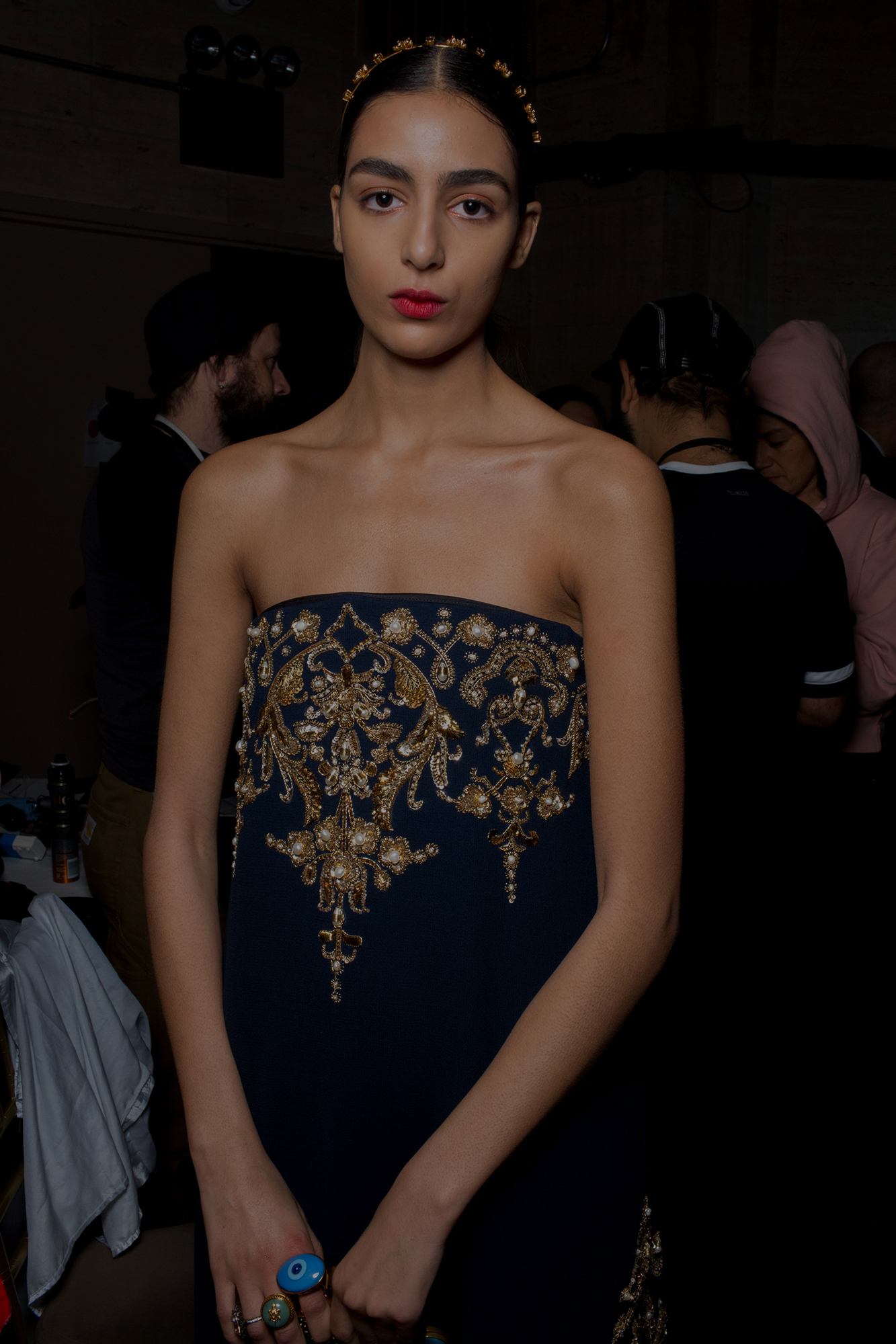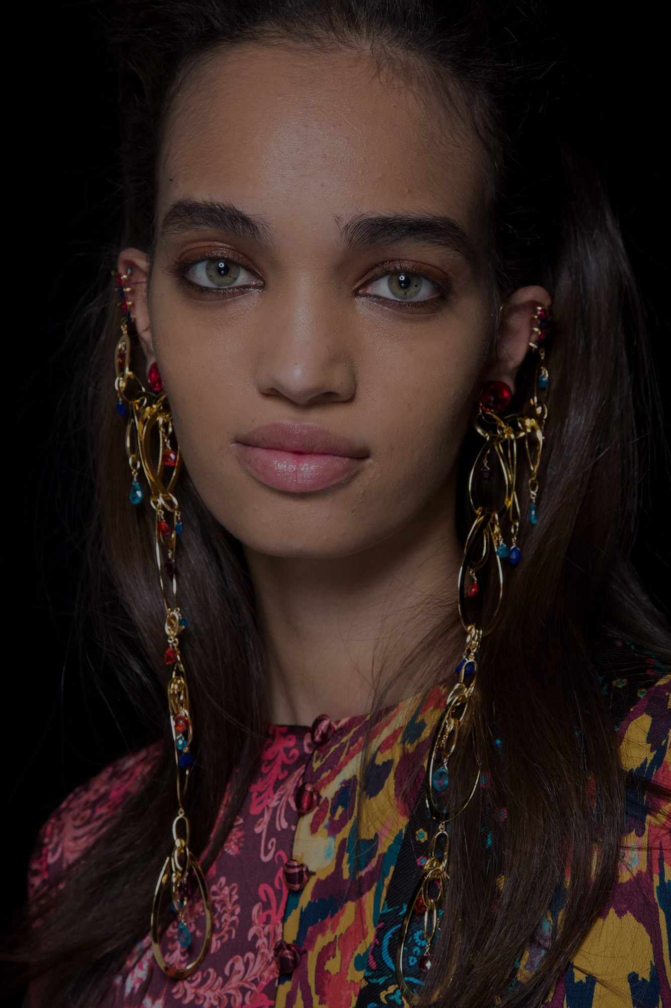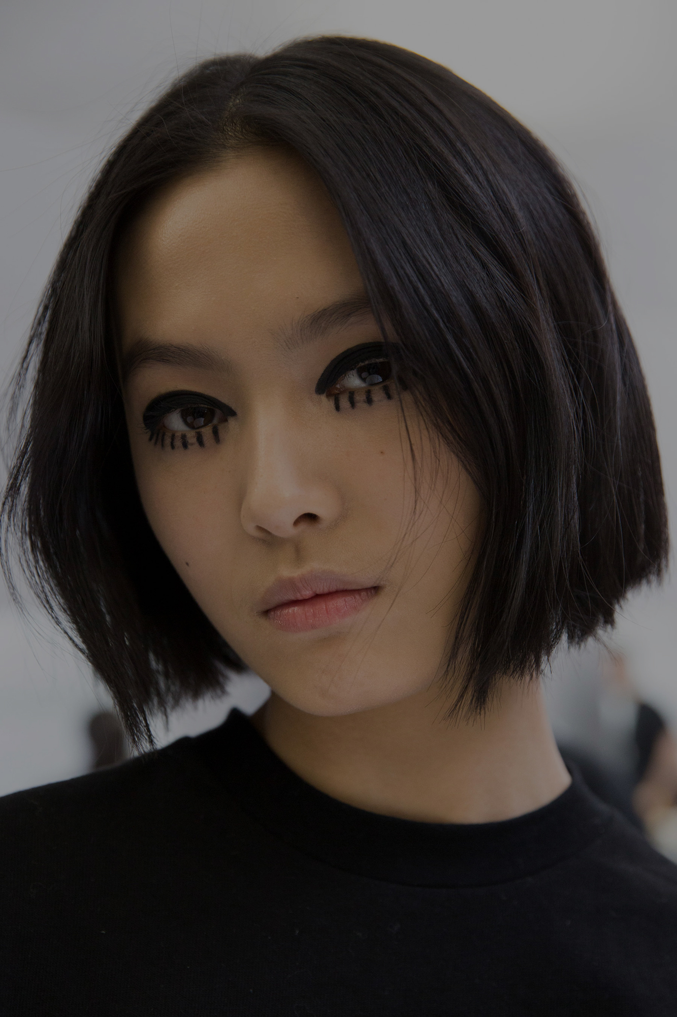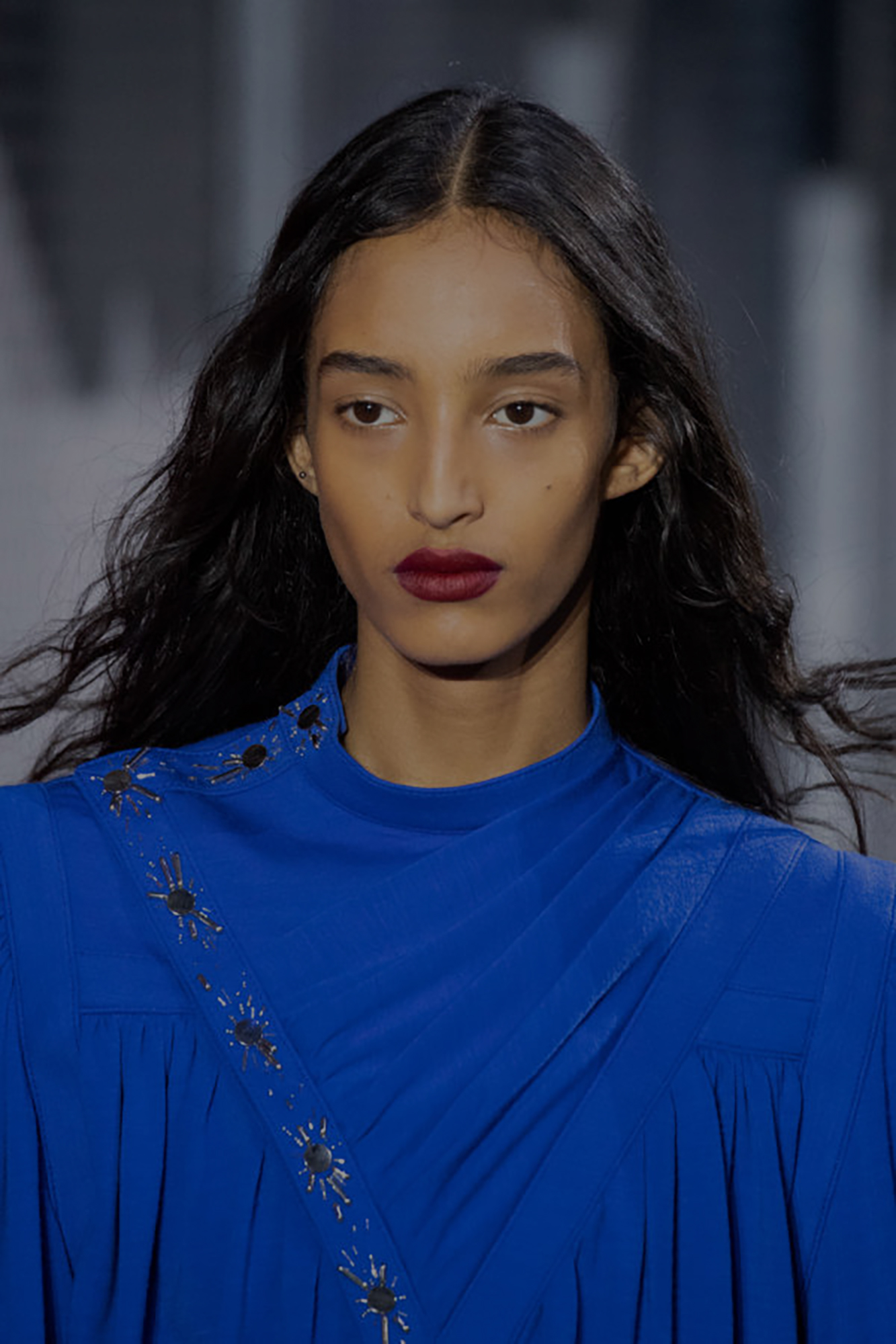 Пэт Макграт, главный визажист показа Louis Vuitton, совместила в образах графичные стрелки с растушовкой к виску, алые губы и дополнила макияж объёмными бровями.