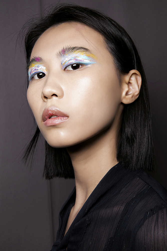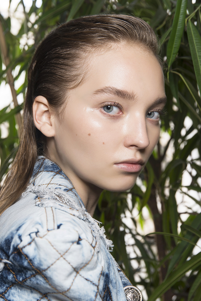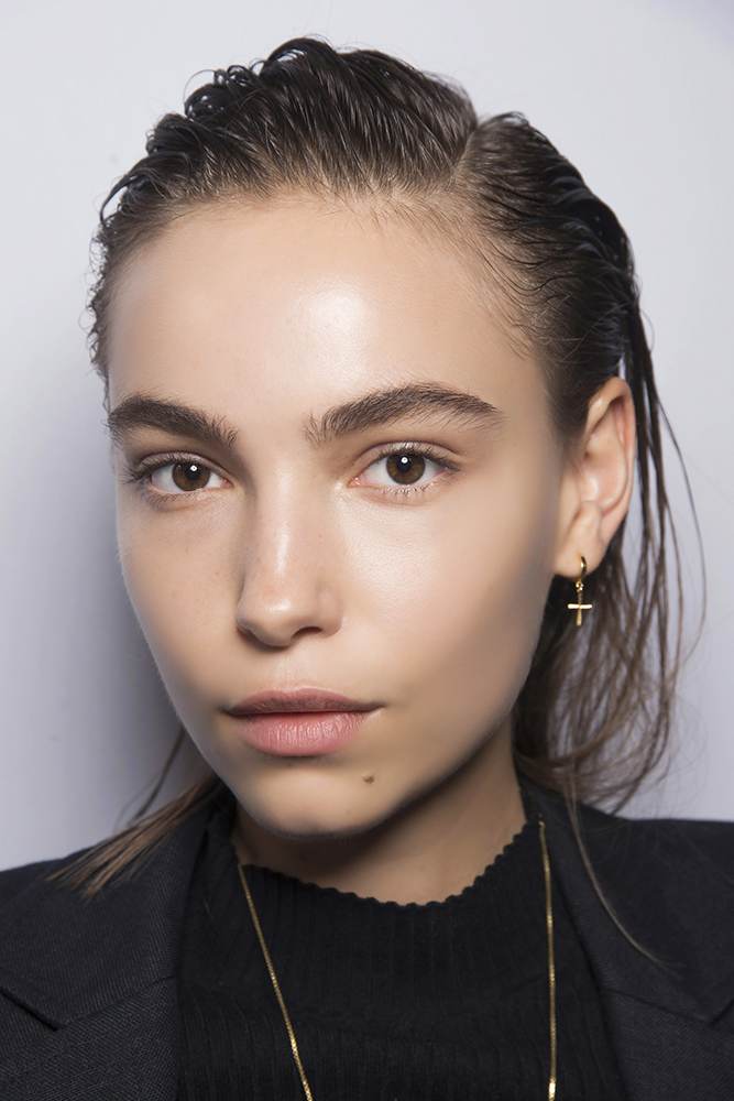 На показе Balmain фактурность лиц моделей была подчеркнута влажным блеском на скулах и переносицах, что создавало эффект здоровой и молодой кожи. Минималистичный образ дополнили естественные густые брови и подкрученные ресницы.