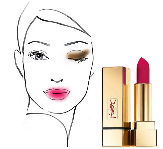 Комментарии ведущего визажиста Yves Saint Laurent Марии Пыренковой: "Чтобы придать коже ровный стойкий тон, нанесите новый тональный крем Le Teint Encre De Peau круглой кистью — он идеально сольется с вашим тоном кожи и не потребует нанесения пудры. Область вокруг глаз, Т-зону и скулы подсветите при помощи кисточки-хайлайтера Touche Eclat, а на скулы нанесите нежный персиковый оттенок средства для губ и щек Baby Doll Kiss & Blush 07 Corail Affranchi. Затем выделите брови карандашом Dessin Des Sourcils. Медный тон палетки теней Leather Fetish Palette нанесите на внутренний уголок глаза, двигаясь к центру подвижного века, а внешний угол выделите черным сияющим оттенком, растушевывая его к вискам. По нижнему контуру ресниц растушуйте немного бронзовых теней из этой же палетки, а на ресницы нанесите глубокий сливовый оттенок туши Mascara Volume Effet Faux Cils Baby Doll 05. Бархатистая текстура помады Rouge Pur Couture The Mats идеально увлажнит губы и придаст им нежный матовый тон: нанесите оттенок 208 Fuchsia Fetiche в два слоя".