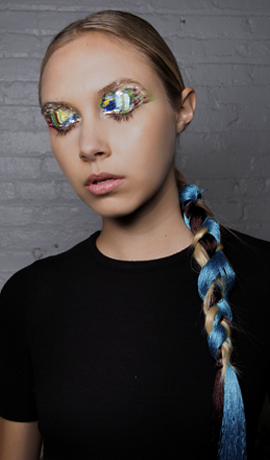 Похожие прически создали и для шоу The Blonds. Здесь акцент был более ярким и заметным, так как прядь была заплетена в неаккуратный пучок на самой макушке.