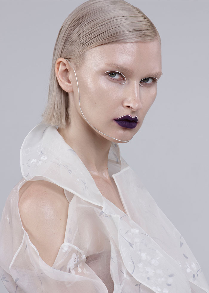 На создание образа для подиума меня вдохновил показ Maison Margiela на Неделе Моды в Париже, который они провели летом 2017 года. Они сделали футуристичный макияж с акцентом на губы и элементами из фольги. Им удалось объединить в образах моделей легкость и брутальность, этого эффекта пыталась добиться и я. Для этого было необходимо сделать тон кожи идеальным, очень свежим — я бы сказала прозрачным. И добавить две выразительные детали: акцентировать губы цветом, а контуры лица подчеркнуть металлической проволокой.