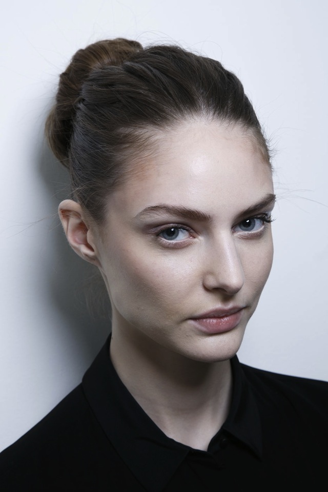 Девушки на показе Diane von Furstenberg выглядели максимально естественно, но над образом пришлось поработать тщательно. Визажист Джеймс Калиардос позаботился о сияющем и ровном тоне кожи, придал лицу более скульптурные очертания с помощью разных тонов консилера, глаза сделал ярче за счет подводки светлого оттенка, нанесенной по нижнему контуру ресниц. На веках заметна серо-коричневая дымка, но она не добавляет яркости в макияж, а, скорее, поддерживает в нем игру света и тени. Вдохновением для Калиардоса и стилиста по волосам Орландо Питы служили балерины, но не сценический их образ, а вид на репетициях. Это и объясняет, почему Пита решил сделать девушкам лаконичные пучки.