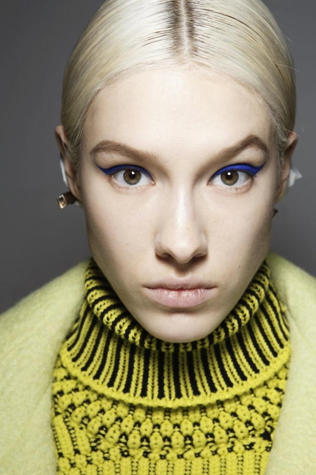 Ультрамариновый цвет в образах с показа отсылает нас скорее к предыдущей коллекции Kenzo, в которой развитие получила морская тематика, но и новую этот контрастный оттенок дополнил как нельзя лучше. Визажист Аарон де Мей выбрал водостойкую подводку M.A.C Chromaline в оттенке Marine Ultra и вывел на веках моделей аккуратные стрелки с острыми кончиками. Идеально ровный тон кожи с легкой тенью на скулах служил основой для этого макияжа. Частью образа стали также низкие хвосты, в которые собрали волосы, разделенные на прямой пробор. Ими занимался стилист Энтони Тернер.