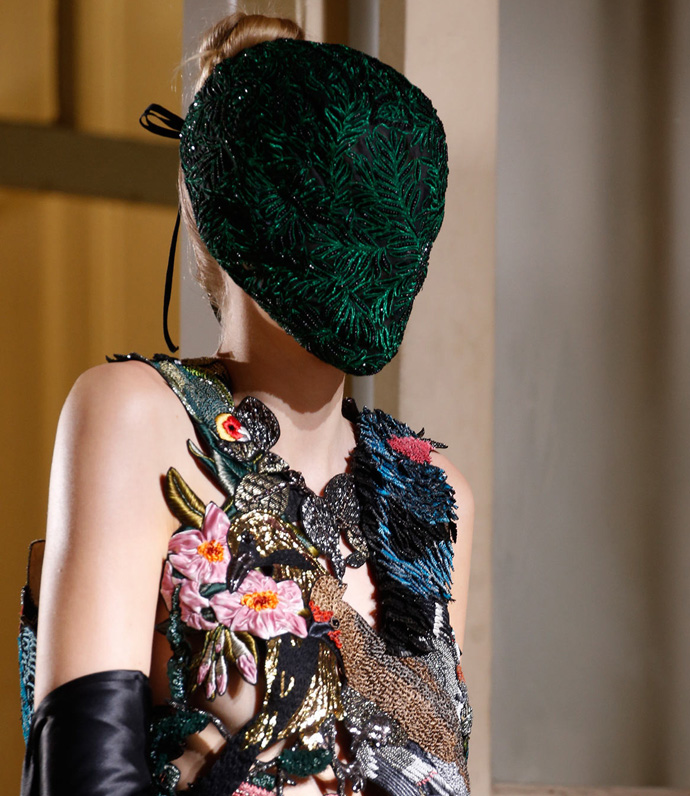 Ими же — украсили разноцветные маски. Некоторые из них были декорированы объемными бутонами, похожими на бутоны камелий, другие — расшиты рисунком на тему выдуманного леса с его утопически изумрудной зеленью, листьями папоротника и оперением сказочной жар-птицы.