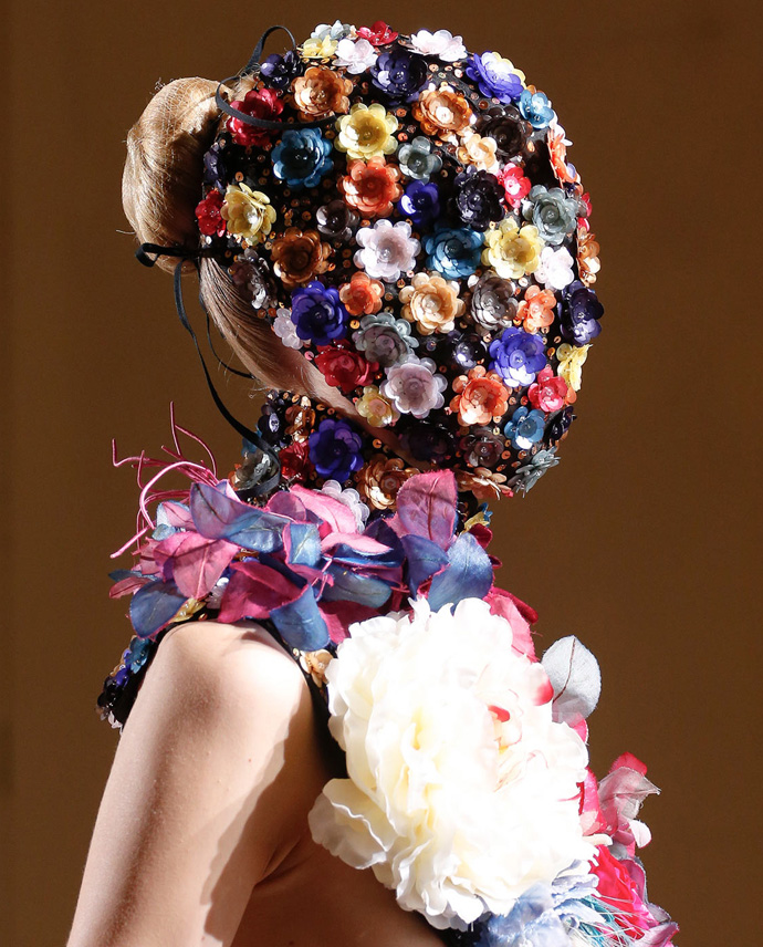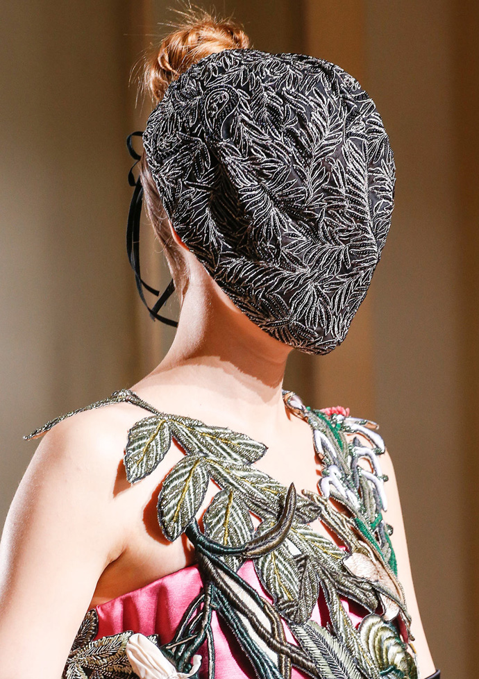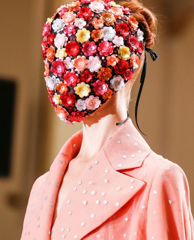 В прошлом году основой для масок стала ткань, вручную расшитая белым и золотым бисером, тут и там украшенная прозрачными черными лентами. А в этом — команда Maison Martin Margiela обратилась к цветам. Цветами они декорировали подолы пальто-трапеций, линии выреза шелковых платьев в пол и вышитые разноцветными пайетками платья-халаты на черной подкладке.