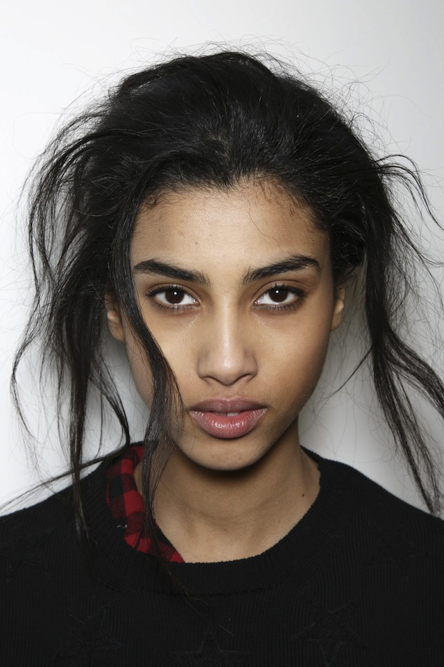 Майкл Корс убеждает нас, что одеваться девушка должна с иголочки, с оттенком шика, но быть безжизненной куклой с идеально ровной прической и безукоризненным макияжем — ни в коем случае. Стилисту по волосами Орландо Пите дизайнер поручил избавить образ от неживого лоска, и это, надо сказать, у первого вышло мастерски. Волосы моделей он убрал назад и без особого усердия заплел в косу, снизу вверх, чтобы не оставалось хвоста. Если вдруг некоторые пряди у лица выпадали, это было стилисту только на руку: он не оставлял локоны приглаженными, напротив, небрежно растрепал их у лица. "Прическа получилась рассыпчатой, она подвижна на подиуме: пряди колышатся и вторят движению тканей", — рассказал Орландо. Объема волосам он добавил с помощью текстурирующей пасты (у корней) и сухого шампуня (по всей длине волос).