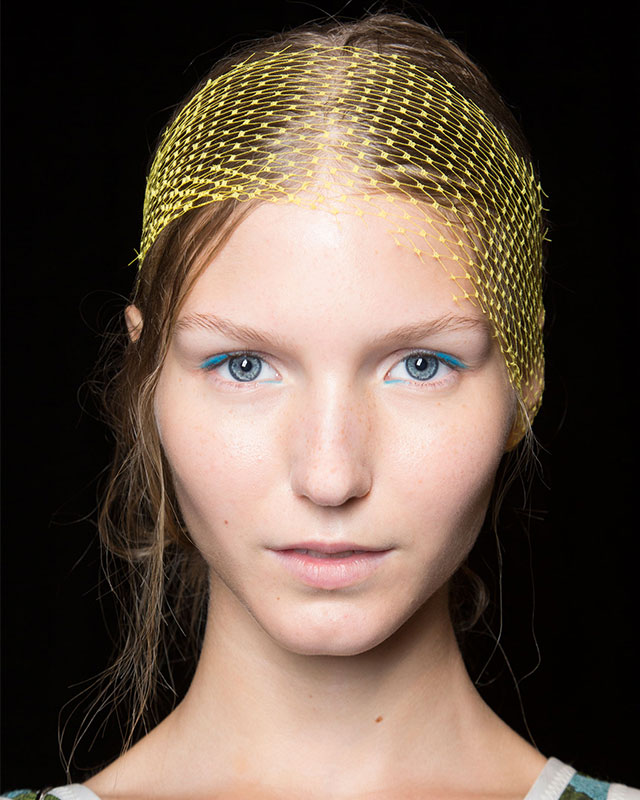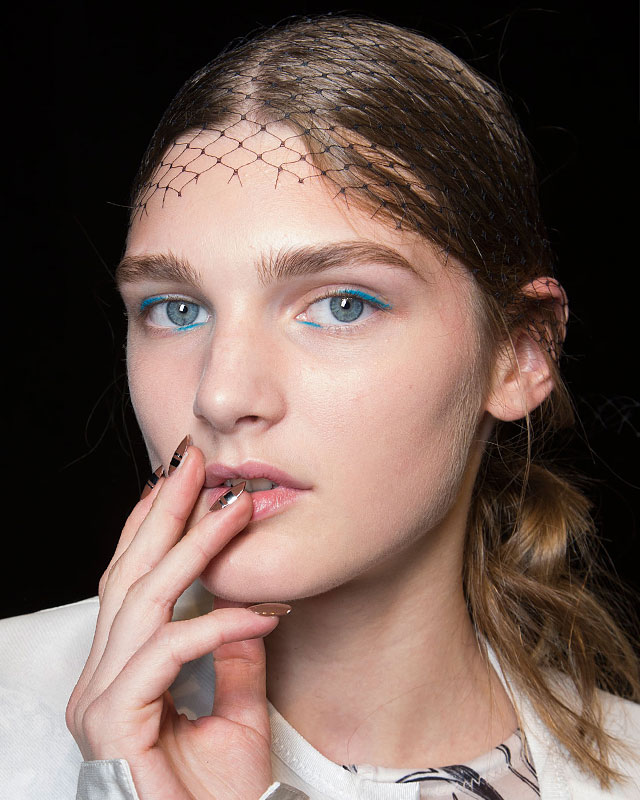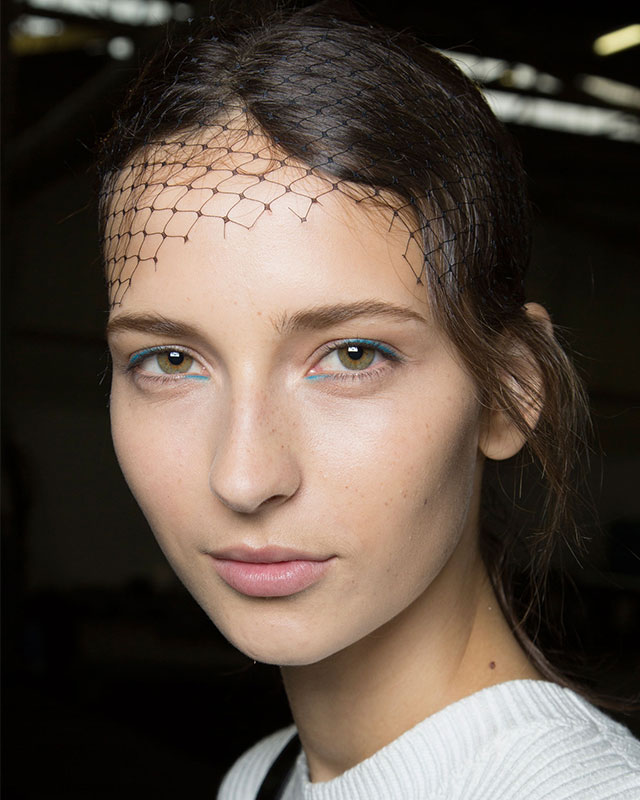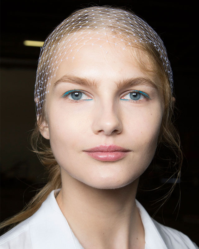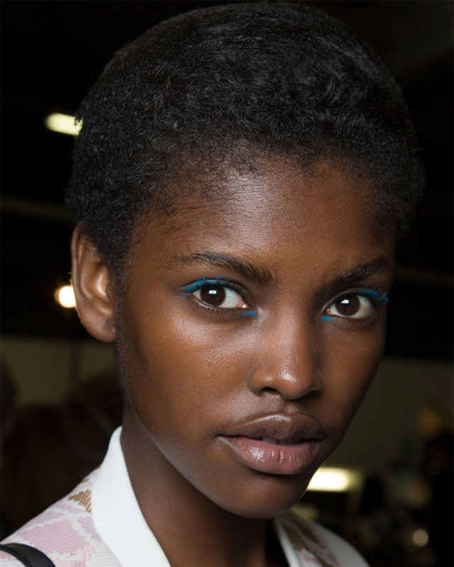 Лаконичные черные и бирюзовые стрелки вполовину верхнего века и легкий штрих во внутреннем углу глаза легли в основу макияжа для показа. Безупречный полупрозрачный тон, легкое сияние и никакого румянца — вот образ девушки грядущей весны. Губы остались без внимания — весь акцент на глаза.
