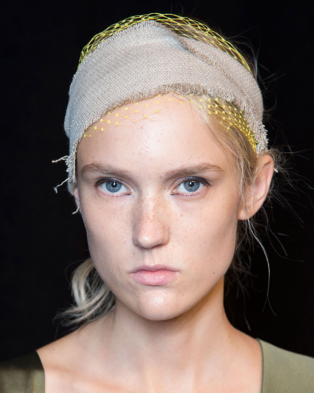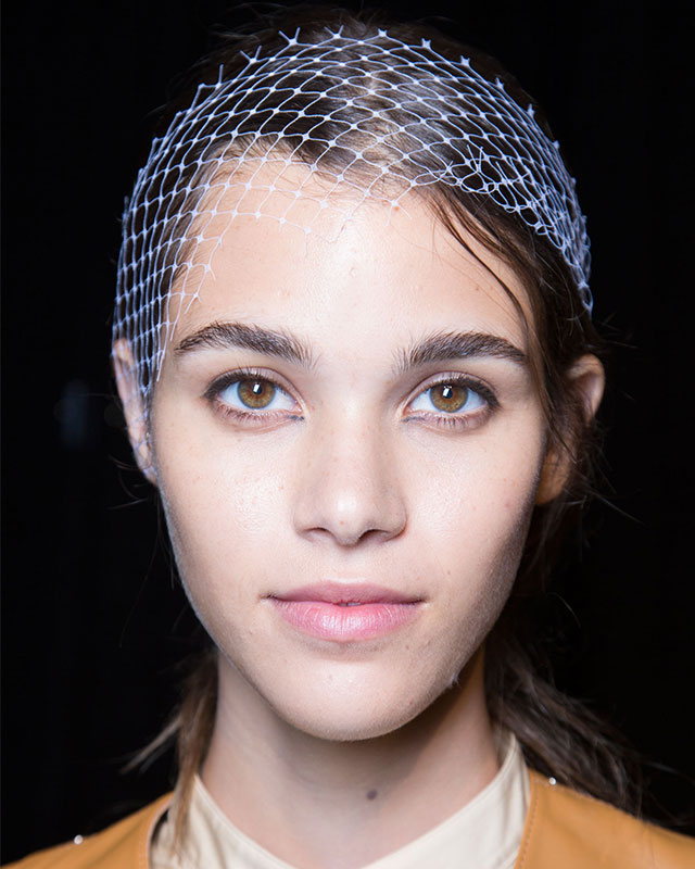 Волосы разделены на прямой пробор, собраны в небрежный низкий пучок, который, очевидно, останется на пике популярности в весенне-летнем сезоне, а головы моделей украшены разноцветными сеточками вместо повязок. Руки украшает маникюр negative space — модный прием, которому уже, кстати, не один год.