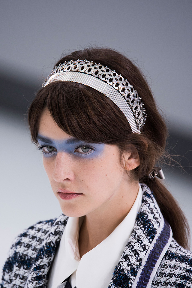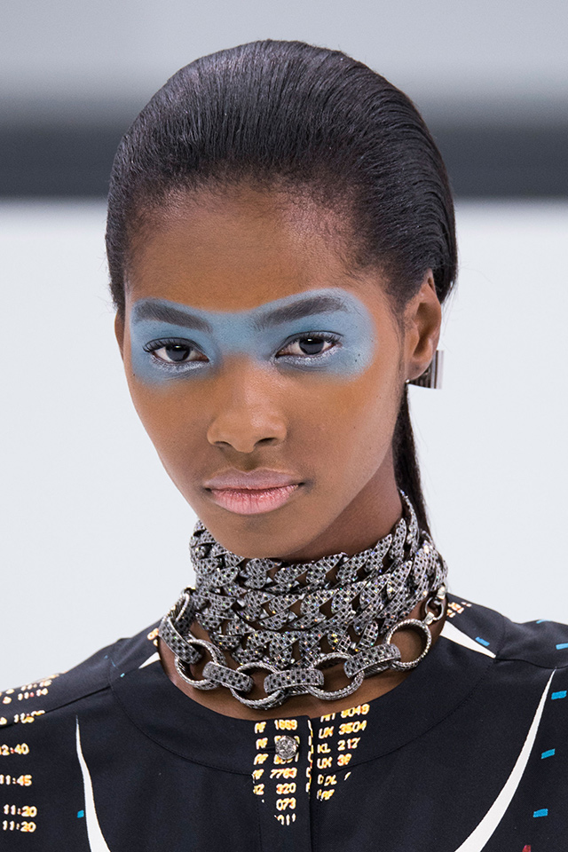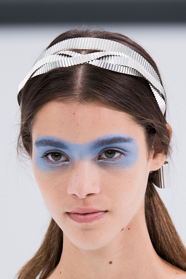 На этот раз образ моделей соответствовал атмосфере, царящей в аэропорту: идеально ровный тон кожи, губы натурального оттенка, а главное — маска на глазах из теней небесно-голубого цвета. Простая прическа — низкий небрежный хвост — была дополнена тонкими серебристыми ободками разных фактур.