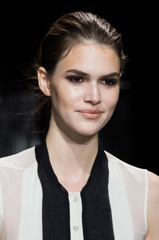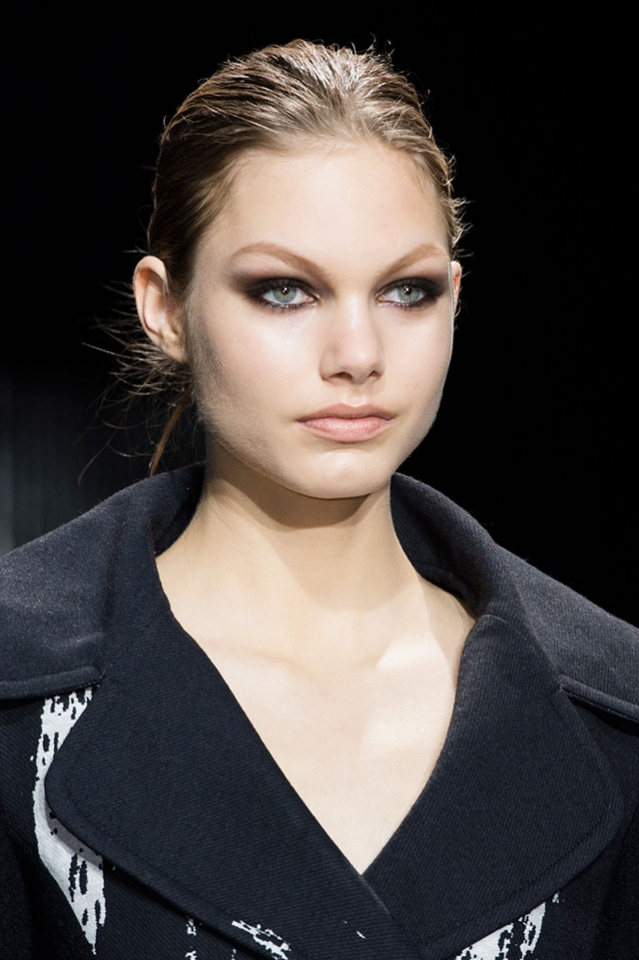 Визажистом шоу стала Пэт МакГрат, сделавшая акцент на мягком smoky-eyes. «Это легкий способ соблазнить, и девушки смогут сделать такой макияж сами», — рассказывает Пэт. Для лица она использовала тональное средство Max Factor Miracle Touch Foundation, добавив немного золотых теней на скулы. Получилась здоровая и сияющая кожа. Второй этап — глаза. Для этого образа Пэт смешала черный и коричневый карандаши для глаз, а затем нанесла поверх два темных оттенка: шоколадный и ониксовый. Завершающий штрих — пара взмахов туши Velvet Volume Mascara.