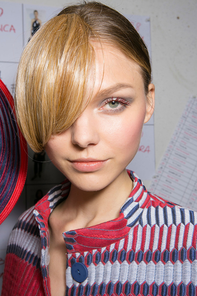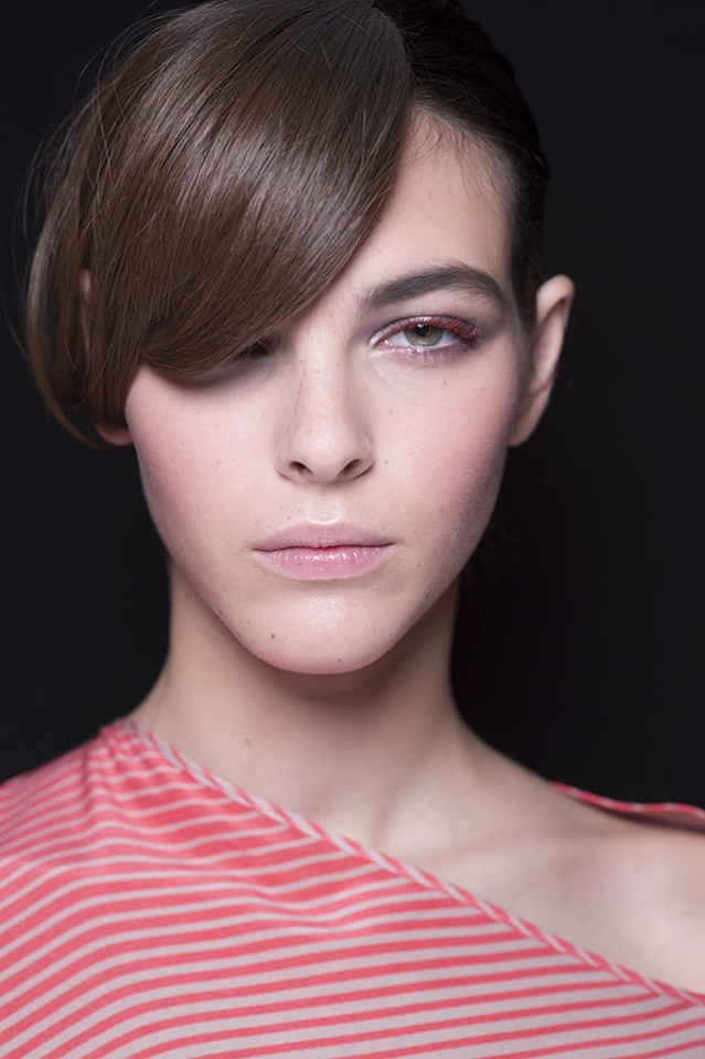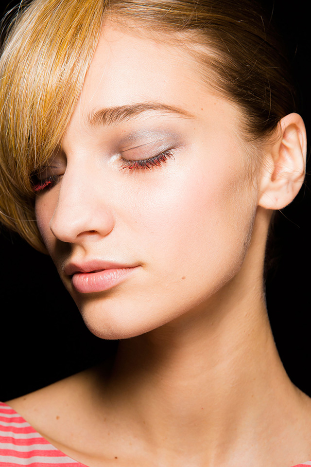 Линда Кантелло, которая не только создает образы для Giorgio Armani из сезона в сезон, но и принимает активное участие в разработке косметики Armani, сделала макияж в жемчужно-серых тонах. Несмотря на то что представленная коллекция посвящена весенне-летнему сезону, макияж был выполнен в сдержанных серых оттенках, однако одну деталь мы не смогли не заметить — красные ресницы. Вернее цвета герани, который гармонично дополнял серый и фиолетовый в одежде.