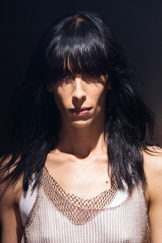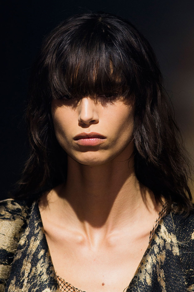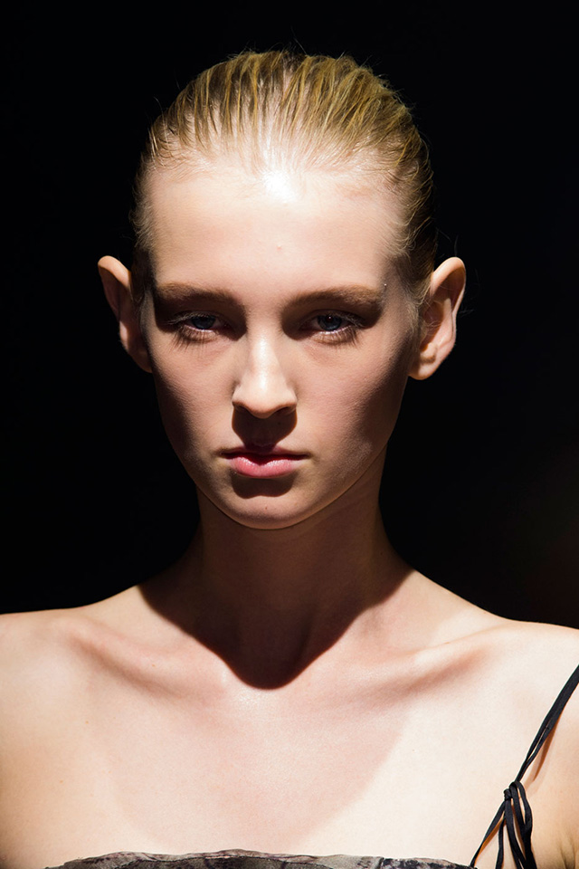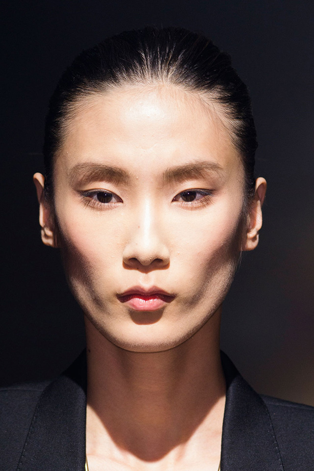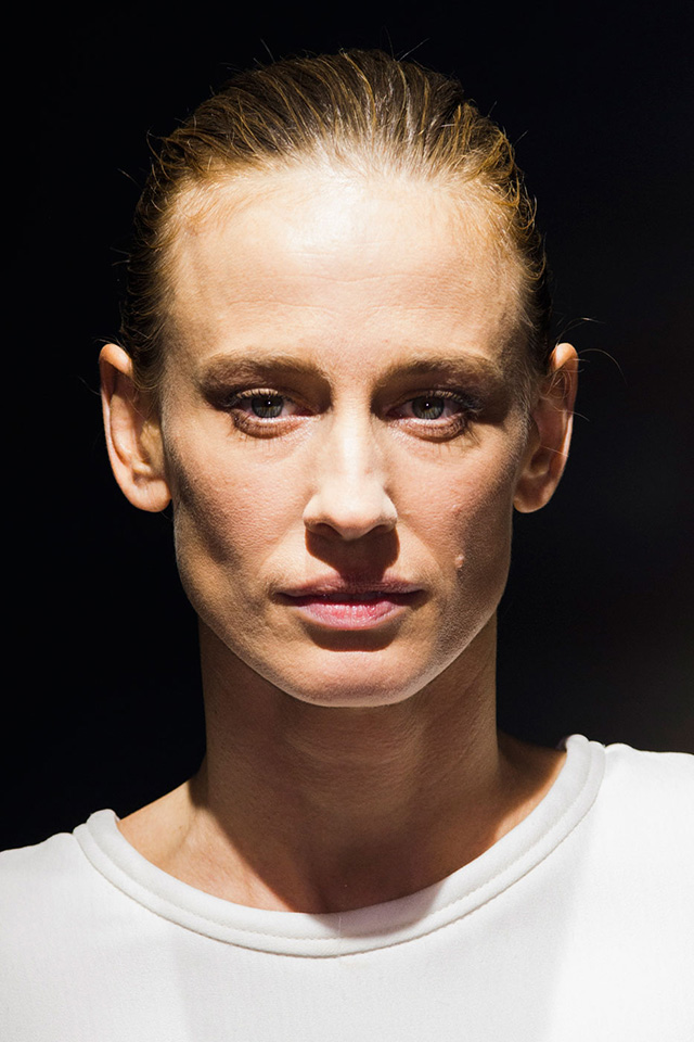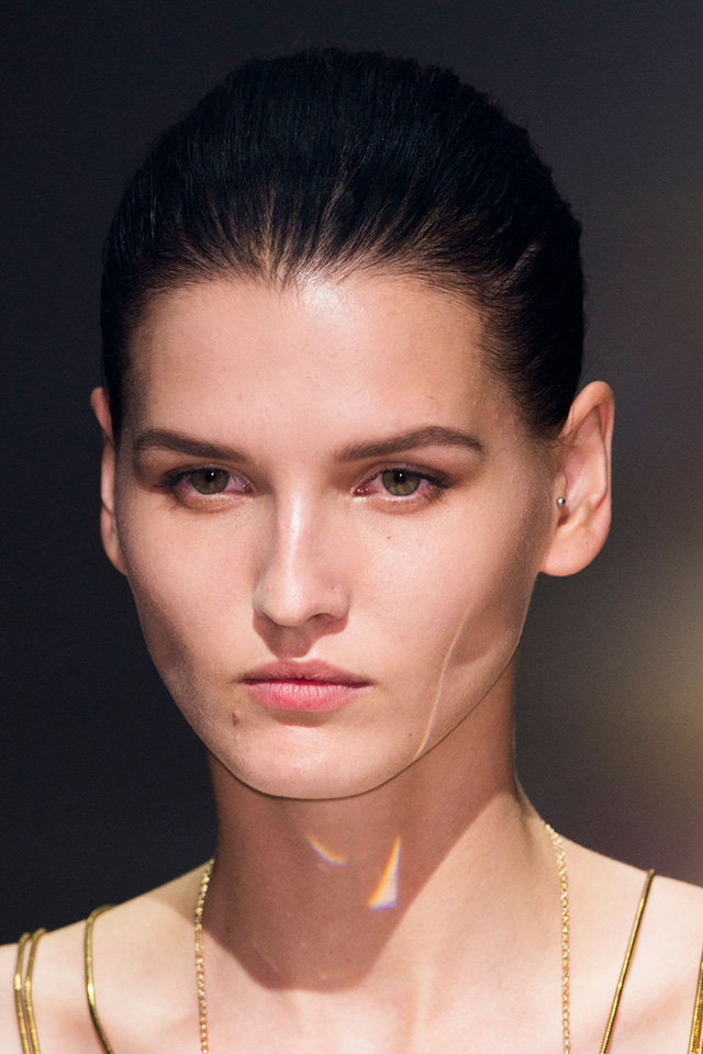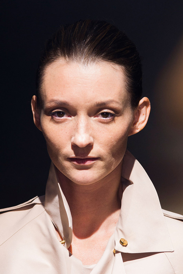 В макияже перед визажистами стояла похожая задача: в показе участвовали модели разных возрастов, следовательно, образ должен был быть простым и подходить им всем. Решением, как всегда, стал nude — идеальная кожа с легким фарфоровым эффектом и правильно уложенными натуральными бровями. Едва заметные золотистые тени в уголке глаза, хайлайтер и капля бальзама — получилось очень женственно и естественно. Настоящая французская классика, которую непременно стоит повторить следующей весной.