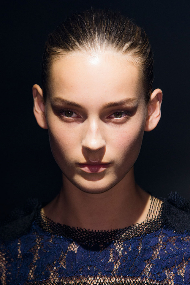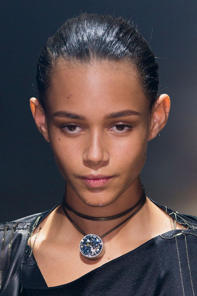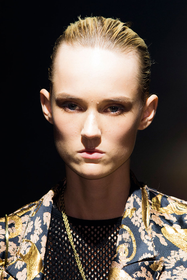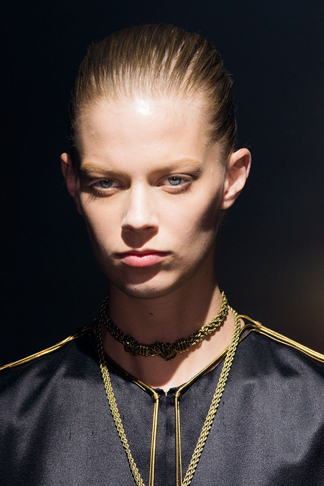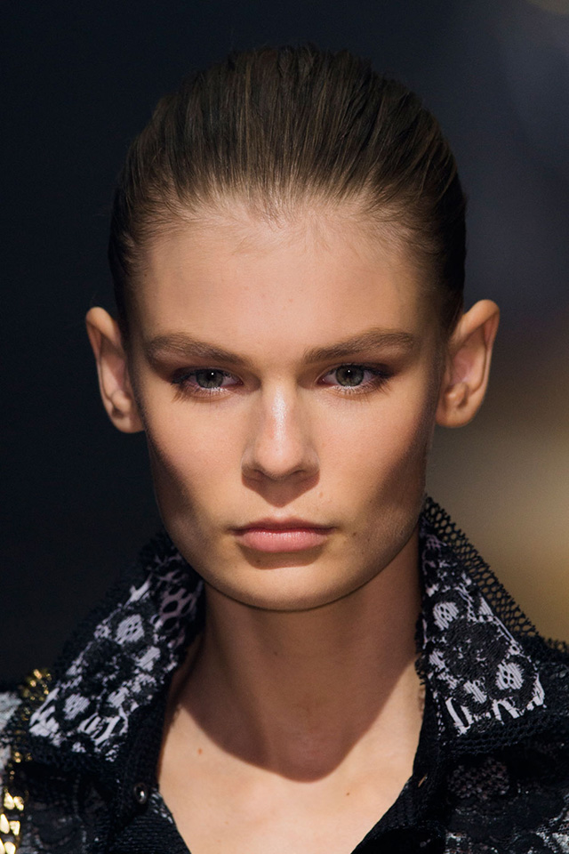 Волосами на шоу занимался Гвидо Палау, выбравший для показа Lanvin классический низкий французский пучок. Для его создания он использовал лишь шпильки и стайлинговое средство Redken Mess Around 10 Disrupting Cream Paste. Стилист объяснил, что в этом году Lanvin празднуют свое 125-летие, и Альбер Эльбаз настоял на легком акценте в виде вечерних украшений. Поэтому Гвидо добавил у основания пучков золотые гребни, специально изготовленные к показу. "Прическа очень простая, но гребни сделали классический облик по-настоящему особенным". Получился действительно очень универсальный образ с яркой деталью, который навевает воспоминания о балеринах из старинных музыкальных шкатулок.