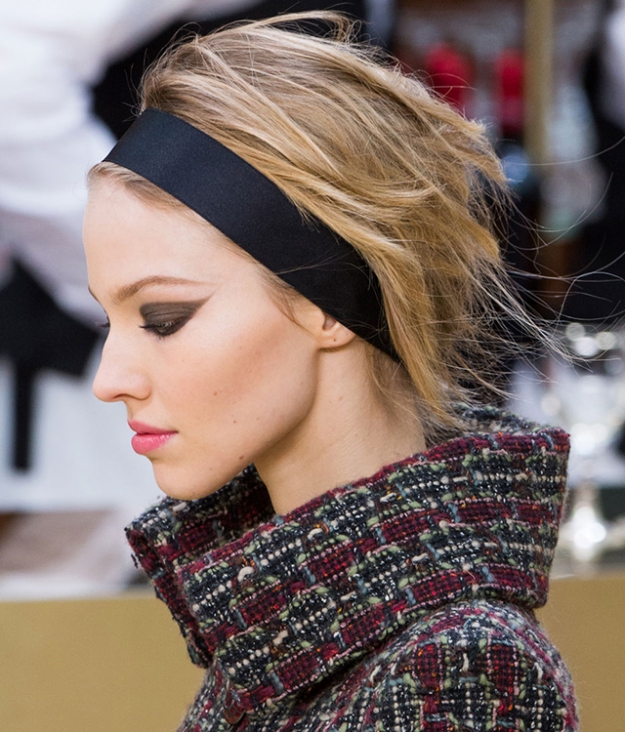На последнем показе Chanel предложили нам сразу два образа современной бизнесвумен: с идеально гладкими волосами, разделенными на боковой пробор, и с небрежным пучком с лентой. Последний вариант, «современный и неаккуратный», демонстрировали Саша Пивоварова и Кендалл Дженнер. Для его создания стилист Сэм МакНайт использовал легкий спрей Bumble and Bumble DrySpun, а затем приколол к волосам ленту. Эту версию визажист шоу Том Пеши дополнил классическим кошачьим макияжем глаз, нарисовав моделям широкие черные стрелки.