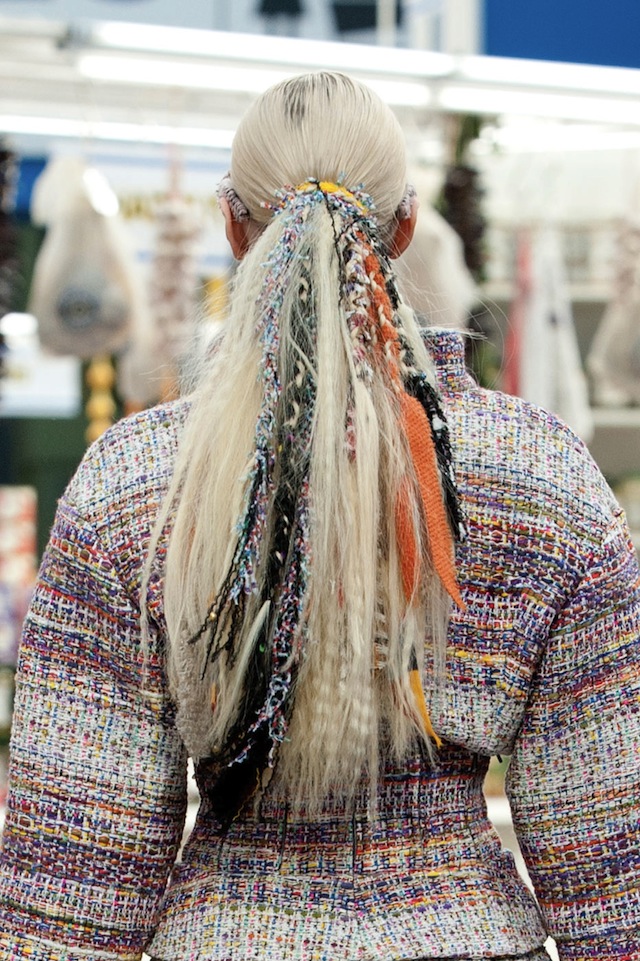 Со стороны может казаться, что у девушек дреды, но это только плюс, если учесть, что оттенок спортивного стиля в коллекции есть (Карл уже второй раз подряд выводит моделей на подиум в кроссовках, а не в изящных туфлях). А в том, что в ход пошли обрезки тканей, можно увидеть не только необычное бьюти-решение, но и намек на безотходное производство — в контексте той тематики, которую задал Лагерфельд, это точное попадание.