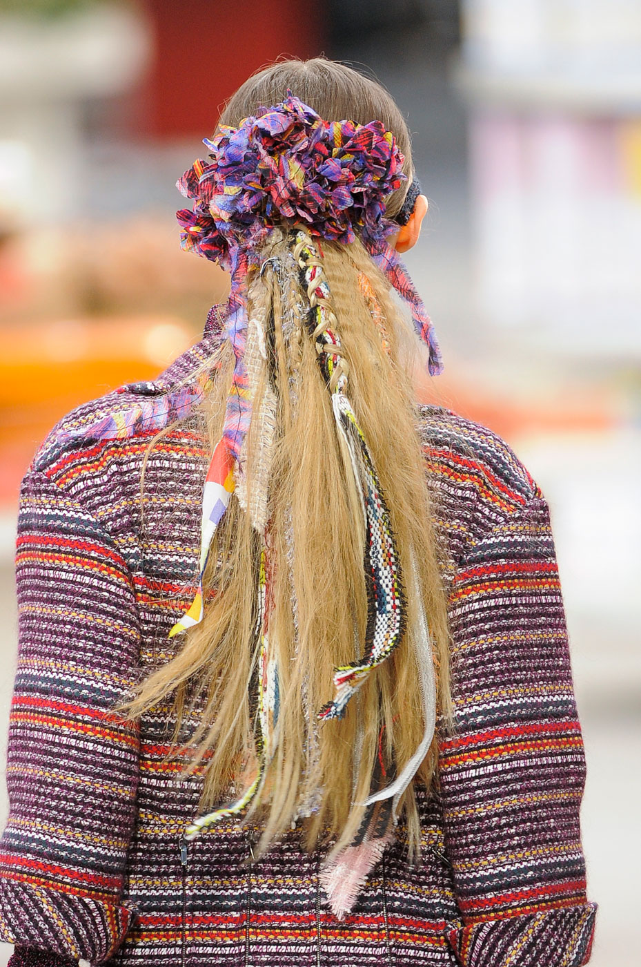 В оригинальности стилист Сэм МакНайт ни на шаг не отставал от Филипса. Начав с подготовки волос, он разделил их на прямой пробор, а также сделал более текстурными с помощью спрея. Затем Сэм собрал их в низкий хвост, который получился объемным благодаря твидовым полоскам и лоскуткам. МакНайт переплел их с волосами и оставил в хвостах, а также использовал в качестве резинок.
