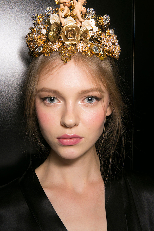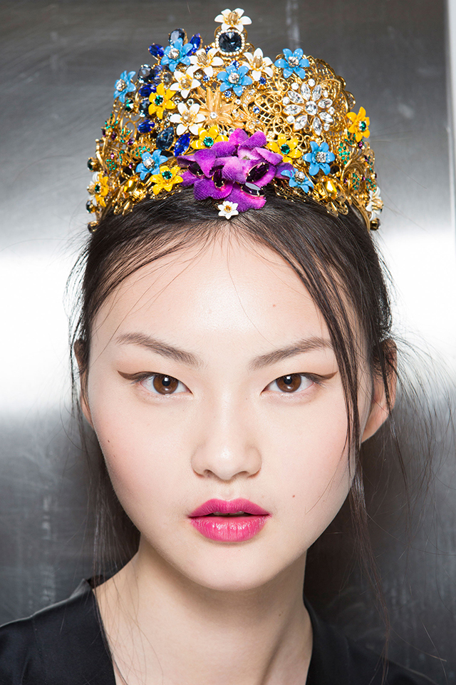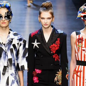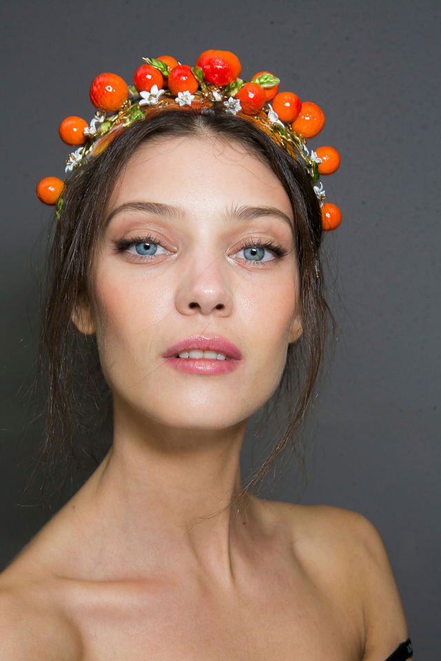 На показе Dolce & Gabbana царил праздник весны и лета: Доменико Дольче и Стефано Габбана вернулись к теме родины — своей любимой Италии. Эту идею гениально поймал Гвидо Палау и создал невозможное: перенес лето на волосы моделей. Дело в том, что головы девушек украшали яркие платки, ободки с разноцветными камнями и ягодами, заколки с цветами.