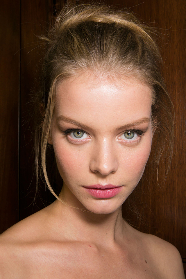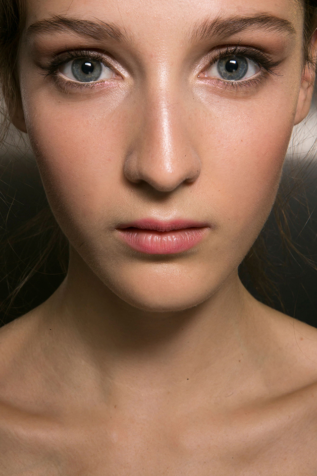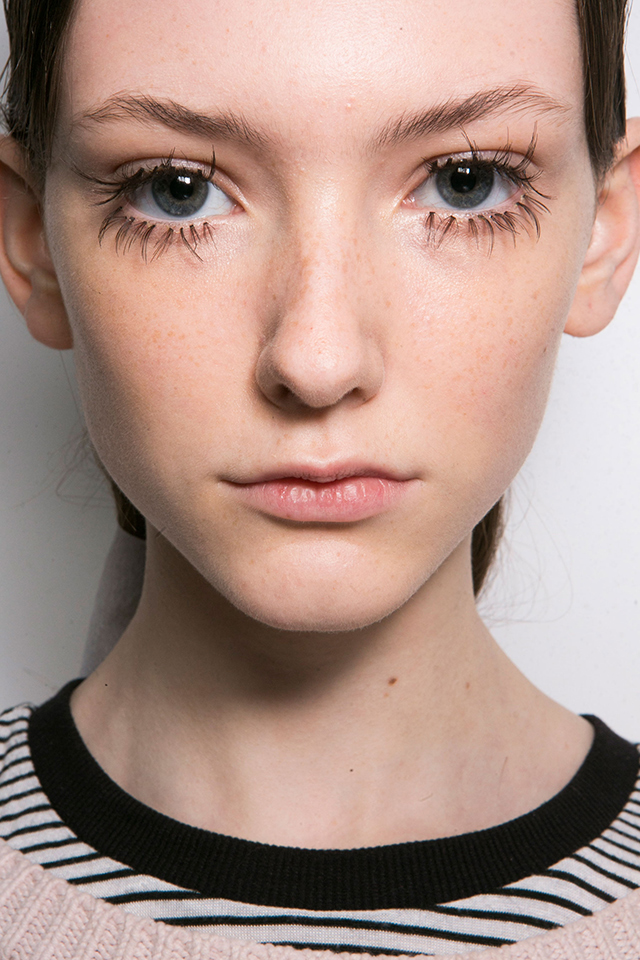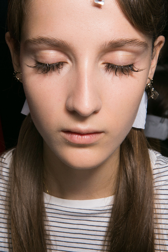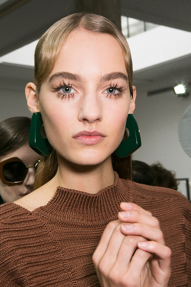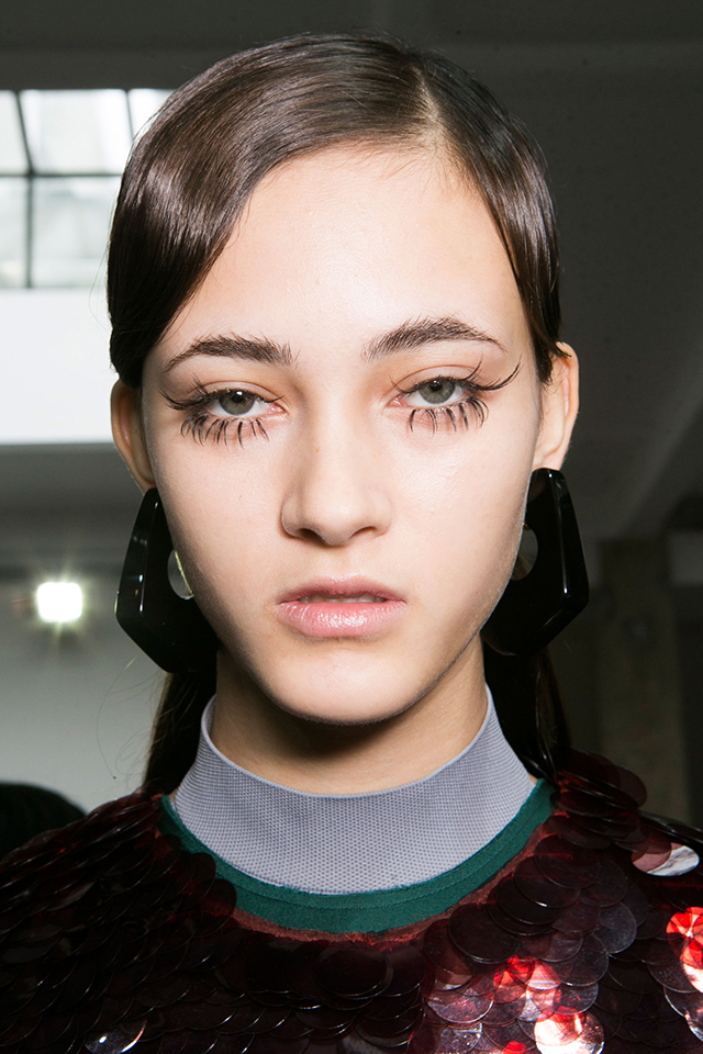 Графика и асимметрия на показе Marni перекочевала из новой коллекции и на головы моделей. Их украшали два «вывернутых» наружу гладких хвоста с асимметричной челкой, которая гармонично перекликалась с тканями. Свежая естественная кожа стала главным акцентом, а глаза украсили длинные пучки ресниц, наклеенные и на верхнее, и на нижнее веко. Модели хлопали редкими ресницами прямиком из 1960-х, чуть напоминающими те, что украшали глаза Твигги.