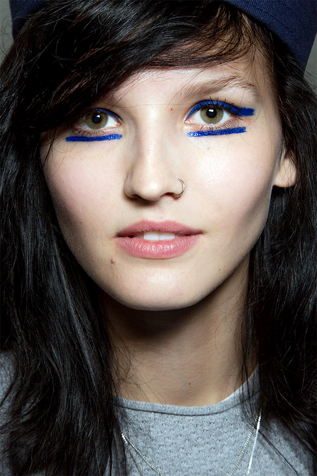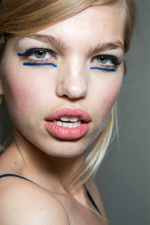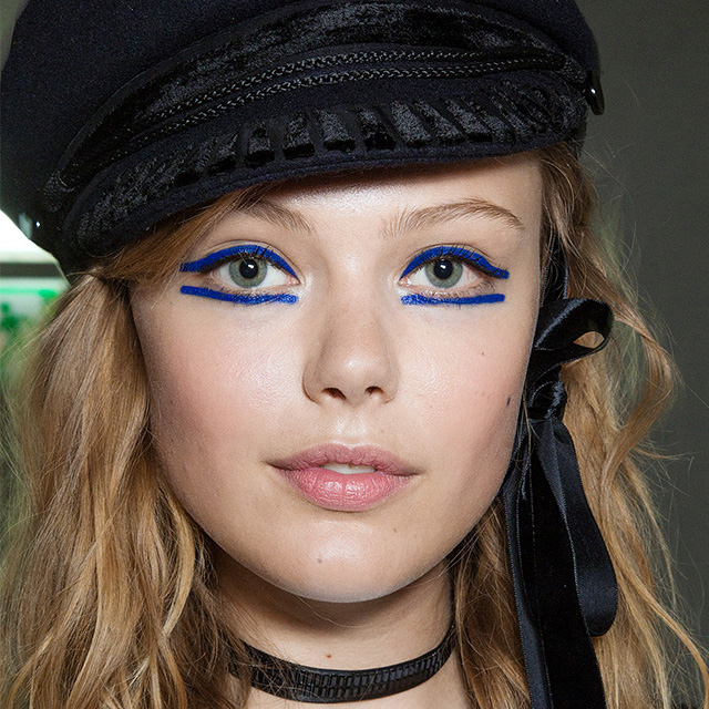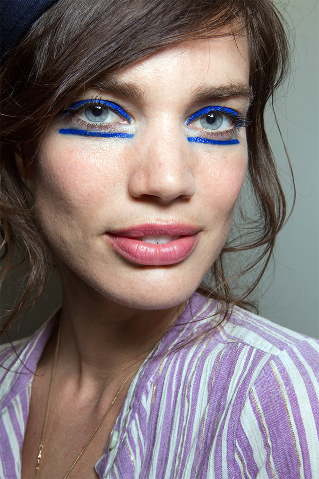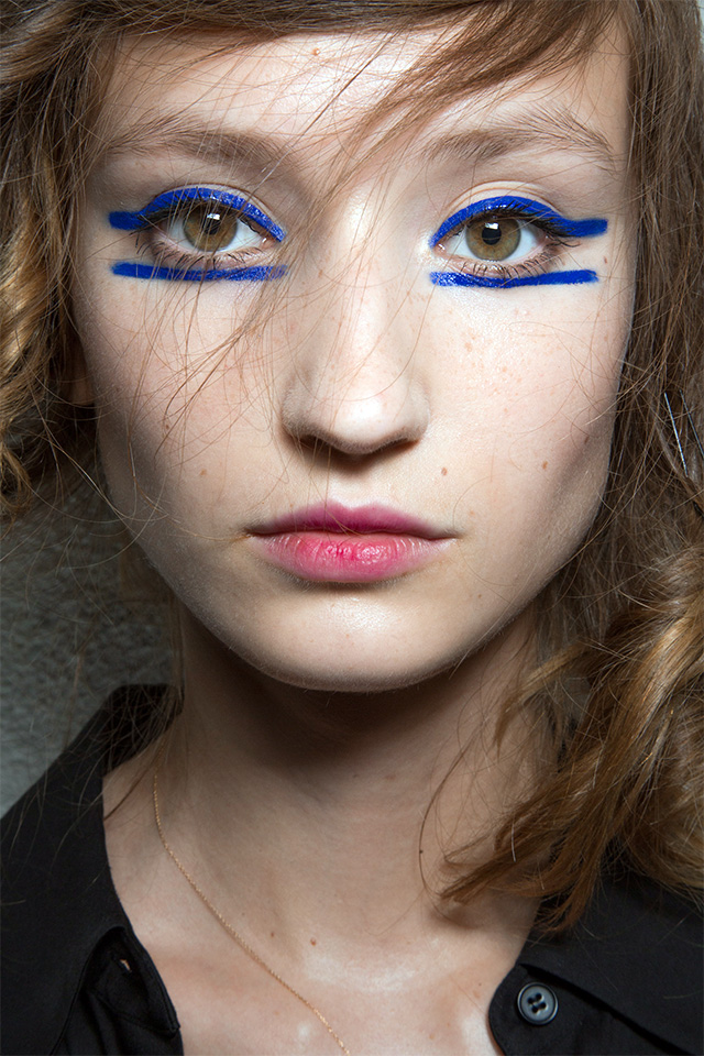 Грядущая осень будет вновь окутана металлическим сиянием разных оттенков — от белесого серебряного до глубокого золотого. Будет много и насыщенного синего, похожего на тот, что с полотен Ива Кляйна. Его оказалось в изобилии в показе Maison Margiela, а также в шоу Jean Paul Gaultier — визажист Ллойд Симмондс широкими мазками нанес тени на верхнее веко, а также прямой линией под нижнее. Добавьте к этому графичные брови, легкий румянец — и макияж готов.