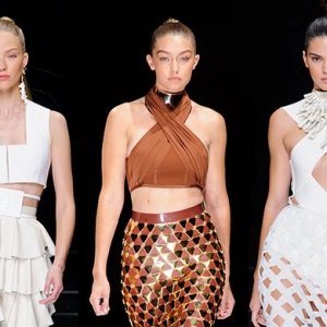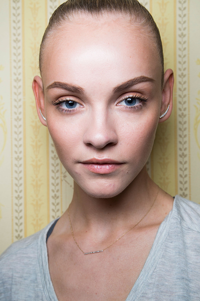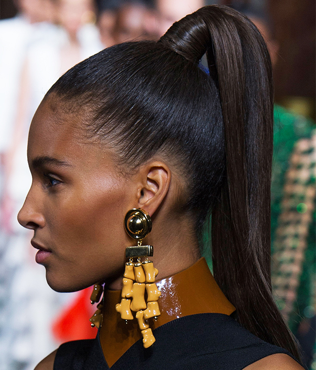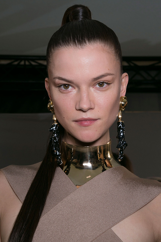 Все внимание на показе Balmain было обращено на высокие и тугие конские хвосты, которые сотворил Сэм МакНайт. Стилист выступает нарочито против естественных, немного растрепанных волн и других всевозможных небрежностей, актуальных в весенне-летний период. Хвосты настолько идеальны, что для пущей строгости резинки скрыты прядями волос.