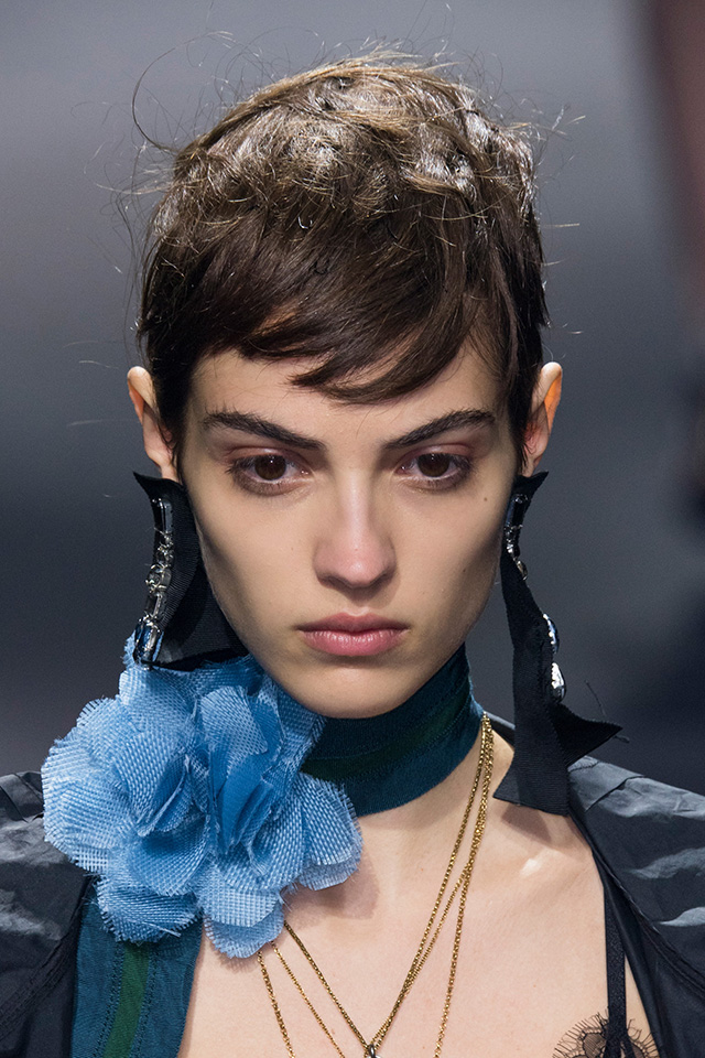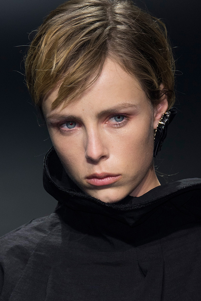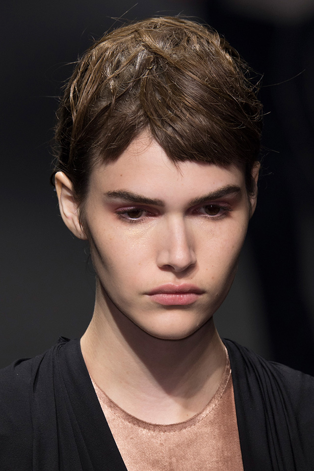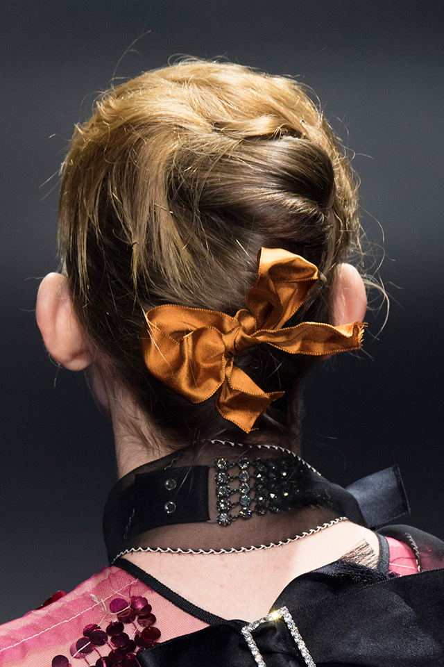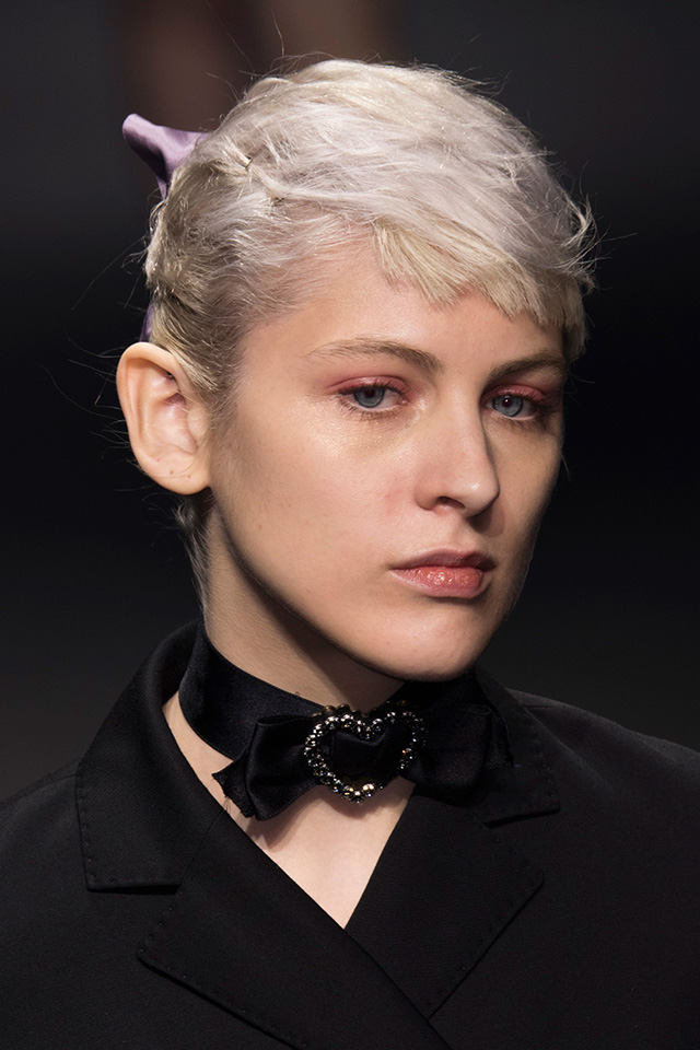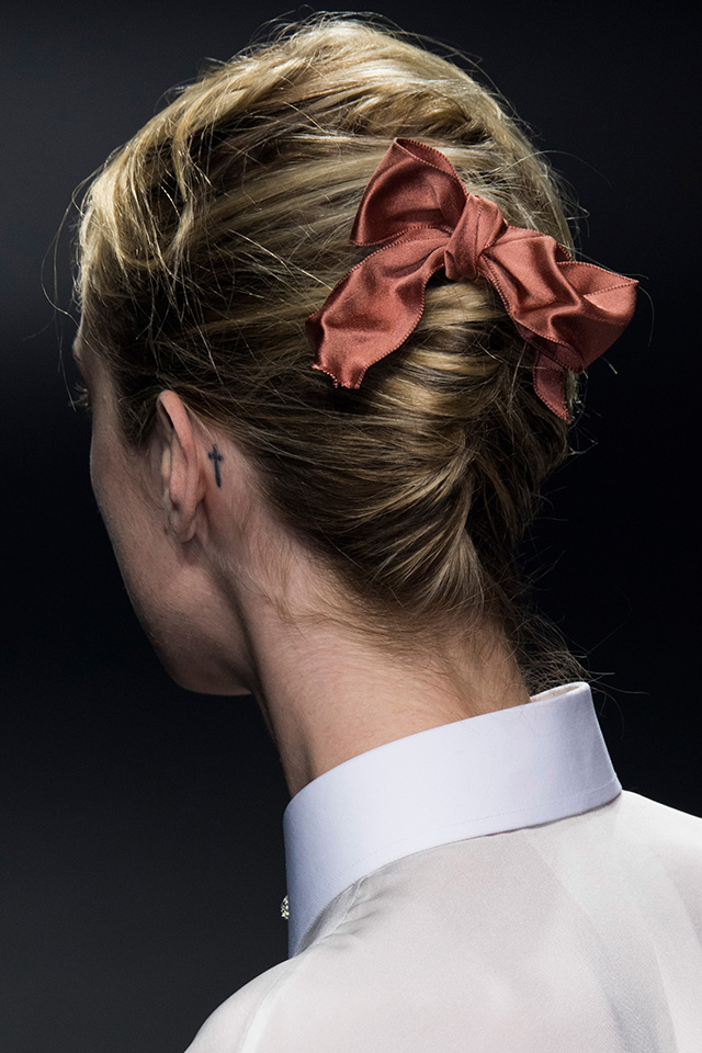 Неоднозначные прически создал Гвидо Палау для моделей показа Lanvin. Спереди модели выглядели андрогинно благодаря коротким накладным челкам, напоминающим мужские стрижки. Проходя по подиуму дальше, важно было разглядеть затылки моделей: их украшали пучки с бантиками.
