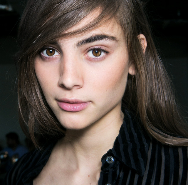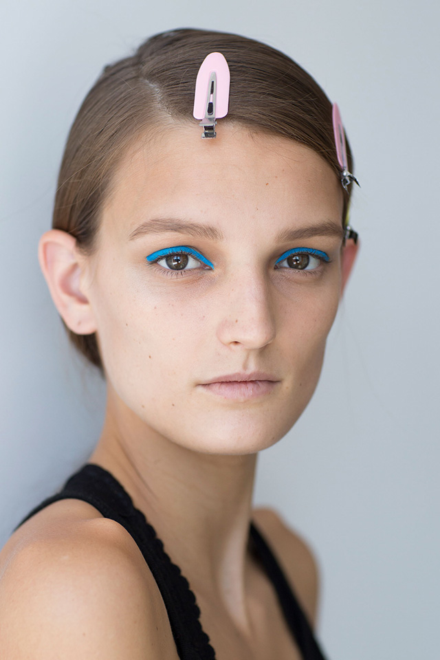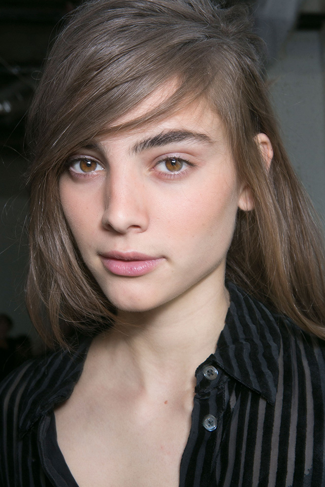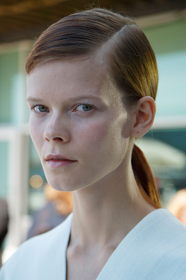 На веки и около уголков глаз визажисты Delpozo нанесли довольно крупные серебряные блестки, поэтому глаза буквально сияли. На этом же показе мы можем видеть другую интерпретацию глубокого пробора — гладкие распущенные волосы с глянцевым блеском ближе к корням.