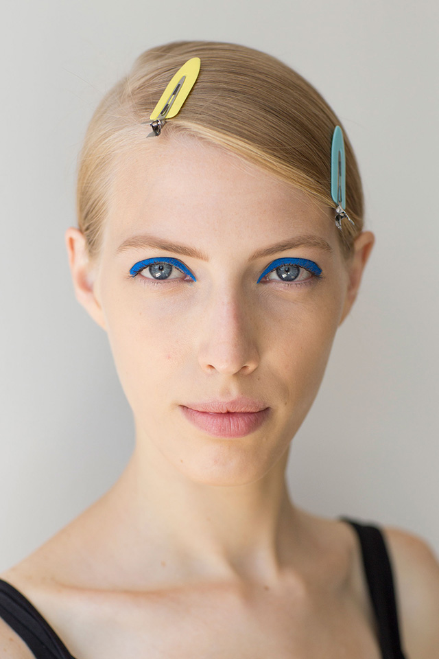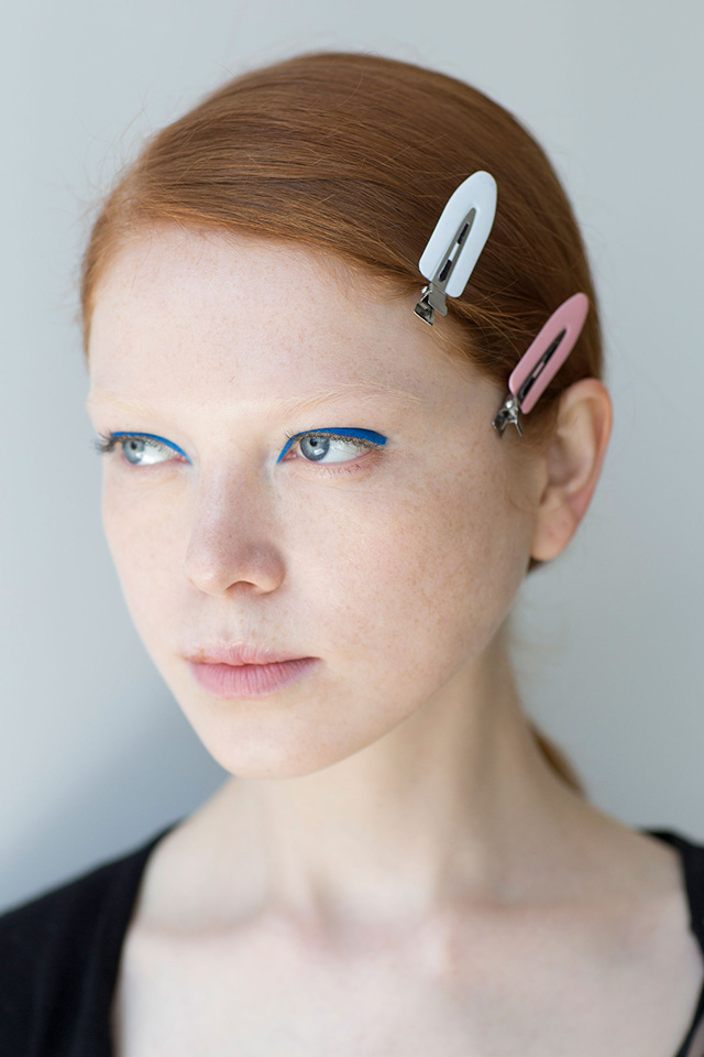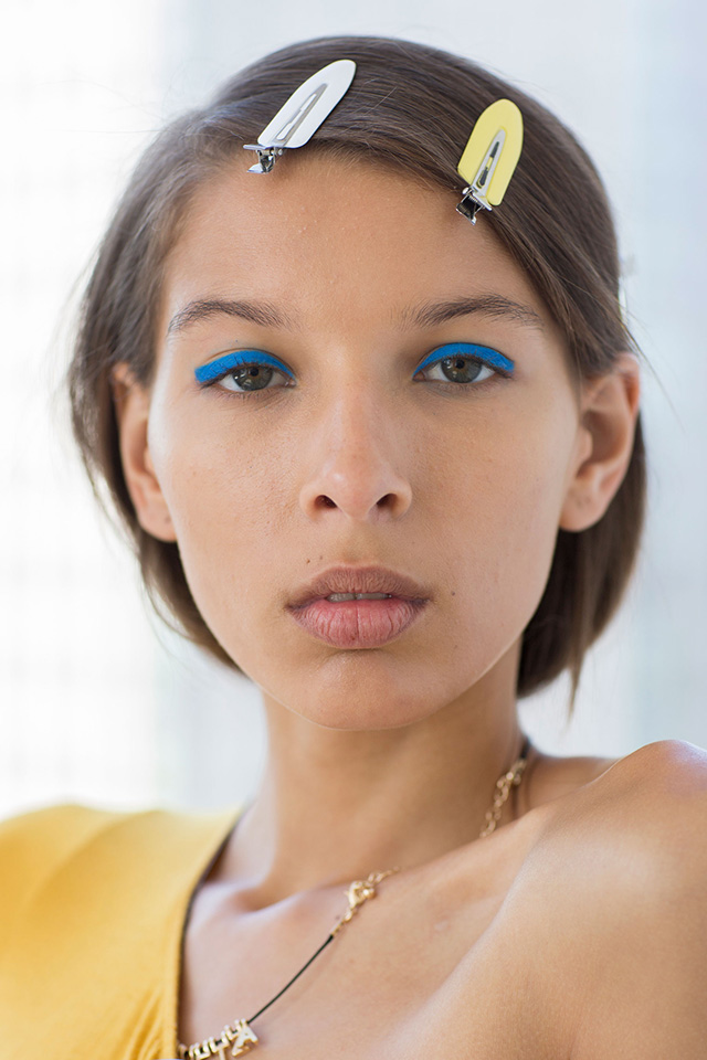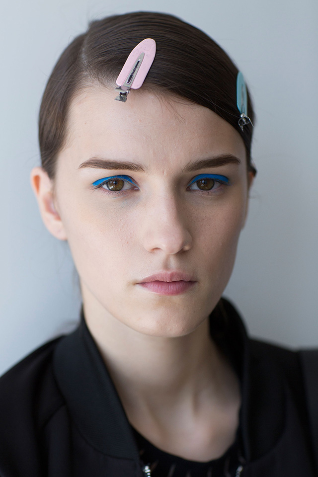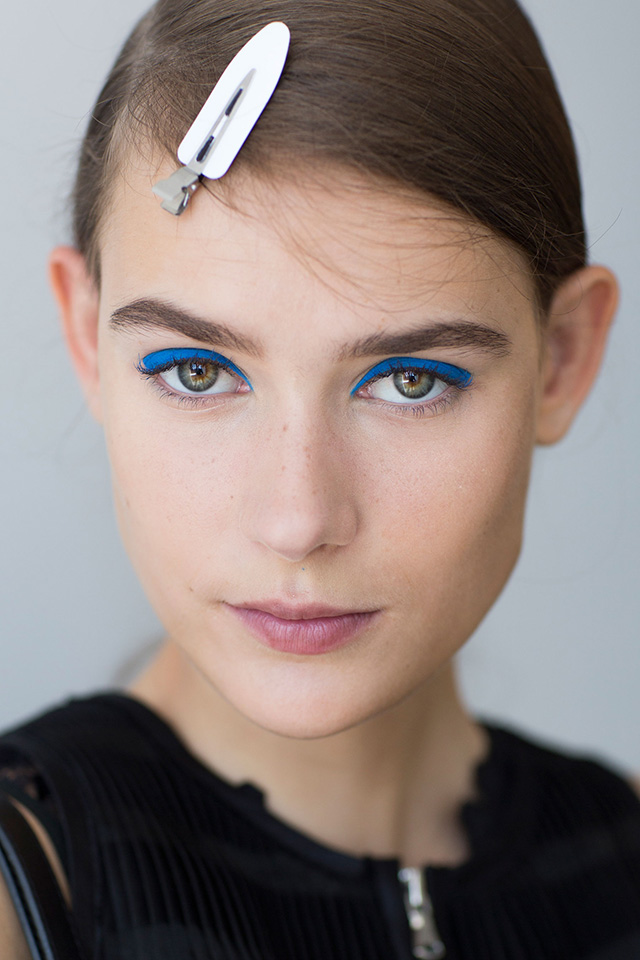 Самый радикальный образ предложили визажисты показа Boss, которые создали по-весеннему яркий макияж. Главным элементом стали лазурно-голубые стрелки вдоль линий ресниц. Никаких больше деталей в бьюти-образах моделей не было, даже румянца — лишь идеально ровная матовая кожа.