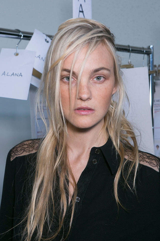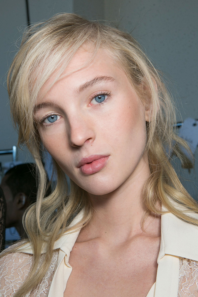 Макияж на моделях Michael Kors Collection был сведен к минимуму: легкий блеск на губах, чуть прокрашенные ресницы, абсолютно матовая кожа и персиковый румянец на яблочках щек. Зато прически моделей Орландо Пита создал такими, будто девушки катались на кабриолете: небрежный низкий боковой пробор и слегка растрепанный пучок на затылке из нескольких прядей.