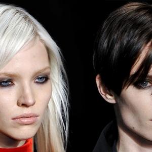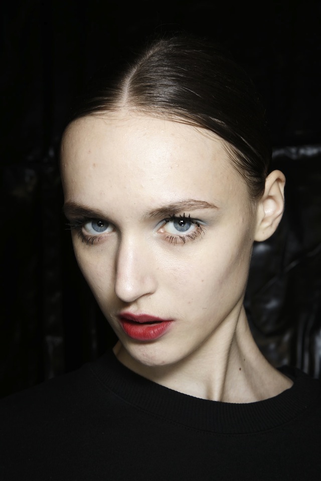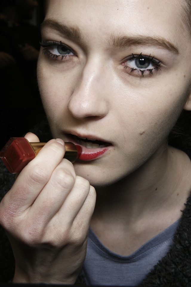 В фокусе у визажиста Пэт МакГрат — вновь ресницы, как и на показе Gucci. Но если тогда она решила продемонстрировать идеальные "кукольные" ресницы, то сейчас Пэт, превращая дурной тон в хороший, нарочно решила их склеить. Комочки туши были ей лучшими помощниками, а не главными изъянами в макияже. МакГрат также не могла не добавить в него хотя бы немного цвета, если учитывать, что новая коллекция Миуччи Прады построена как раз на ярких красках. На веки Пэт нанесла васильковые тени, и получившийся полупрозрачный оттенок не мог не напомнить нам акварельный макияж той же МакГрат с предыдущего показа Prada. Что касается губ, то здесь Пэт решилась на эксперимент: она сказала моделям накрасить их самим, помадой из их личных косметичек. За счет этого образ получился более чем жизненным.