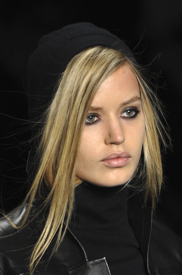 Ее привычный стиль напоминает прическа с разделенными на косой пробор волосами и прядями, падающими на лицо. С высокой точностью воспроизведен и макияж. Шарлотт подвела глаза моделям точно так же, как это делает сама Карин. Темнее всего прокрашен контур глаз, вокруг него растушеван иссиня-черный цвет карандаша и теней. Нижним векам визажист уделила особое внимание. Губы так же, как и у Ройтфельд, у моделей были бесцветными, да и в остальном не было больше никаких акцентов и новых оттенков. Шарлотт разве что подчеркнула скулы девушкам, чтобы еще яснее в их лицах просматривались черты лица Карин. Ее образ как нельзя лучше соответствует духу новой коллекции Tom Ford, в которой речь вновь идет о женской элегантности и силе.