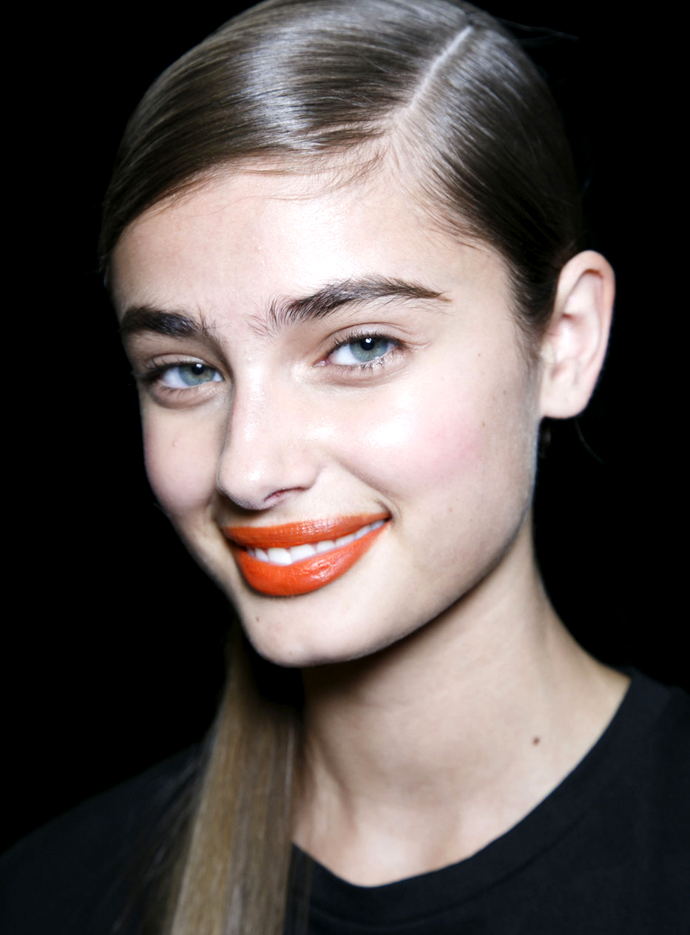 Визажисты по-прежнему неравнодушны к плотной, практически неблестящей текстуре. Оттенки-фавориты — алый и клубничный, оранжевый и сиренево-розовый. Самодостаточность помады таких оттенков очевидна, поэтому она не требует пары в виде ярких теней и сложных причесок. Главное требование — гладкая кожа с каплей румян, пушистые ресницы и блестящие волосы.
