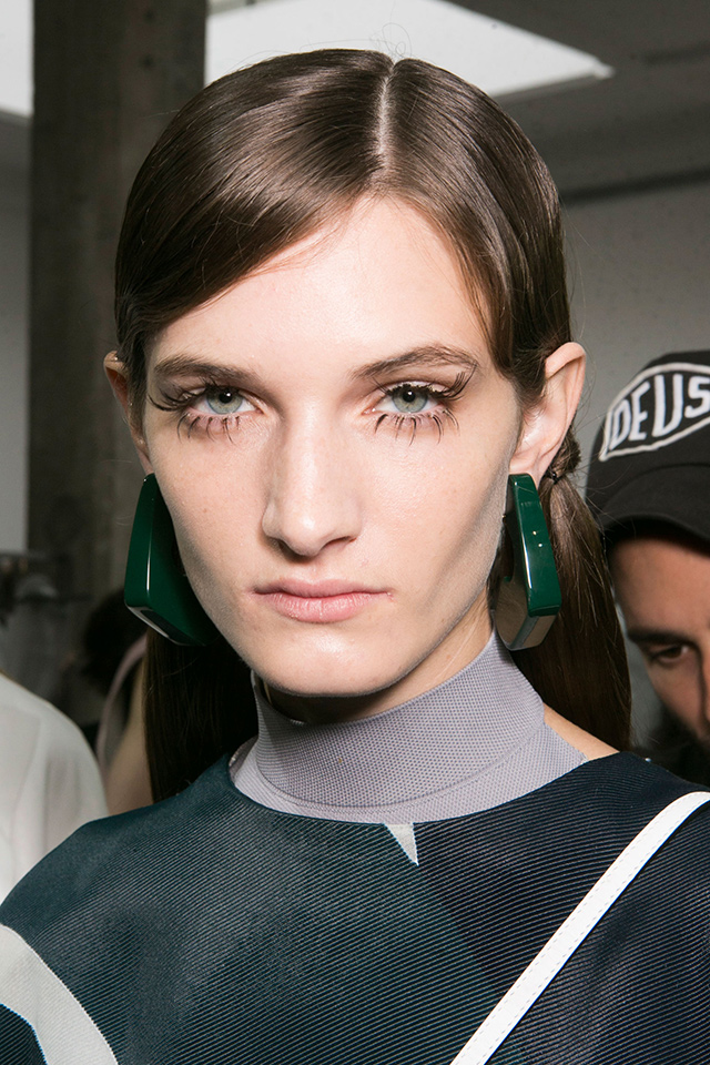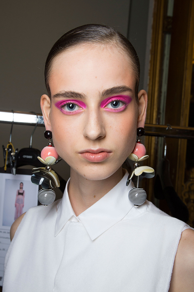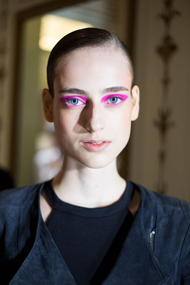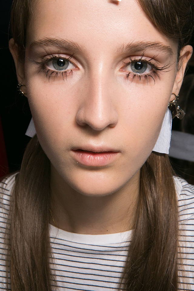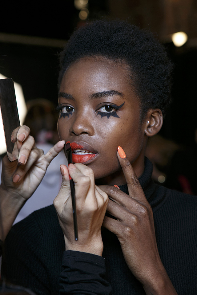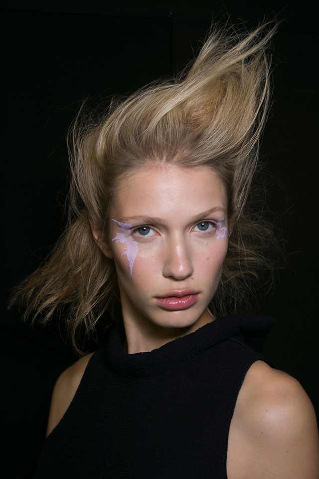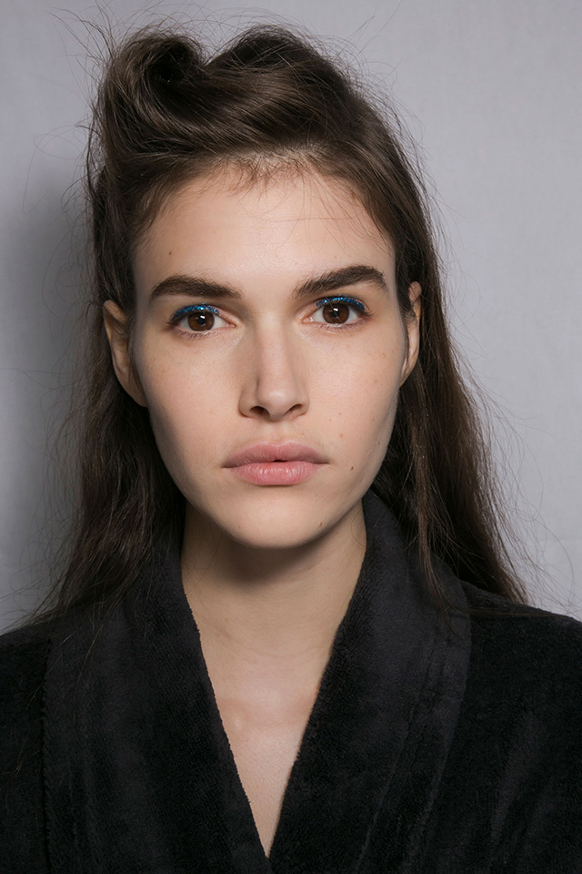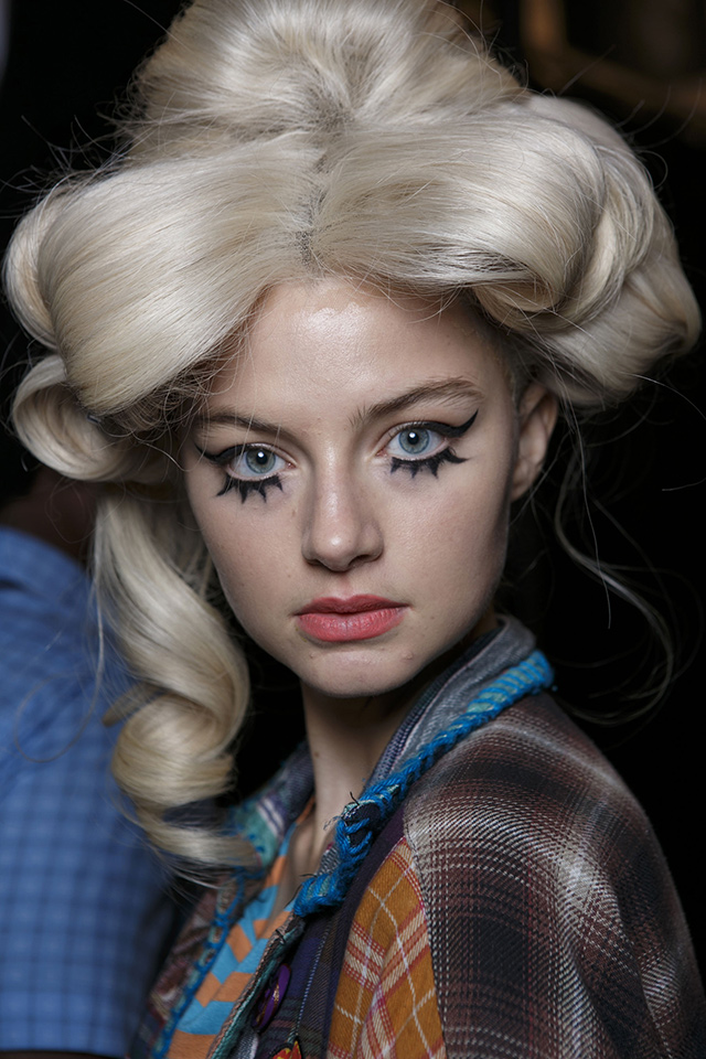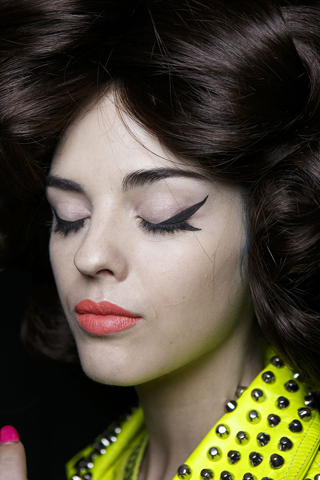 В отличие от нарядов из новой коллекции бьюти-образ моделей этого показа был более сдержанным и напоминал героинь из фильма про Остина Пауэрса. Не обошлось, правда, без объемных париков в стиле 70-х, которые подобрал Юджин Сулейман. На губах — персиковая помада, а на глазах красуются огромные фигурные стрелки и «лучики» под нижним веком.