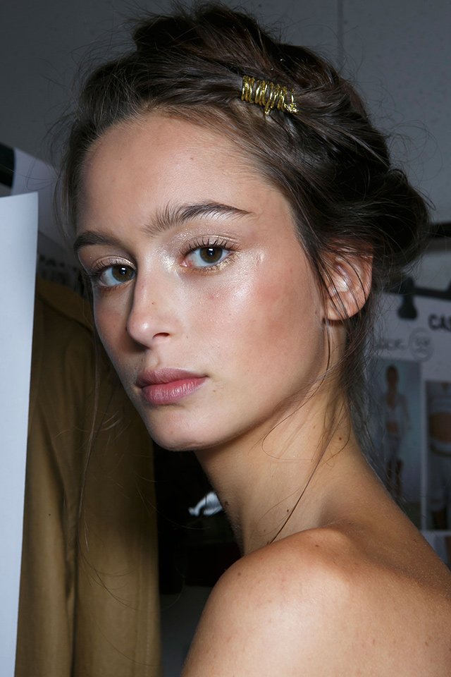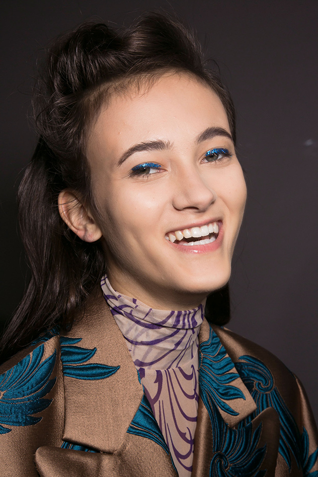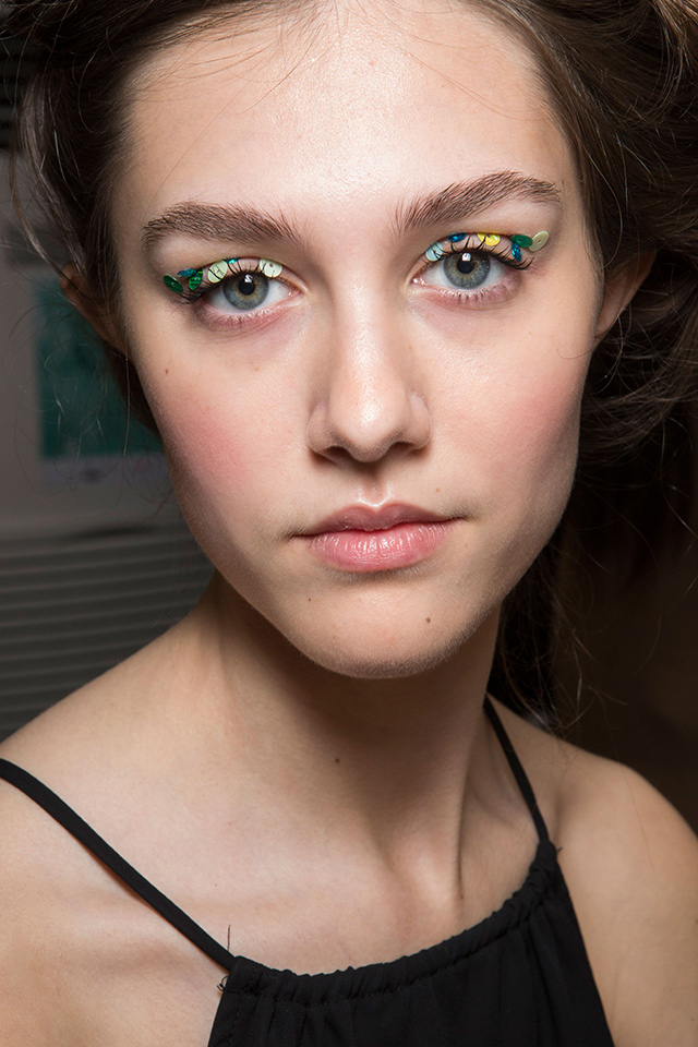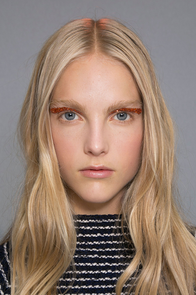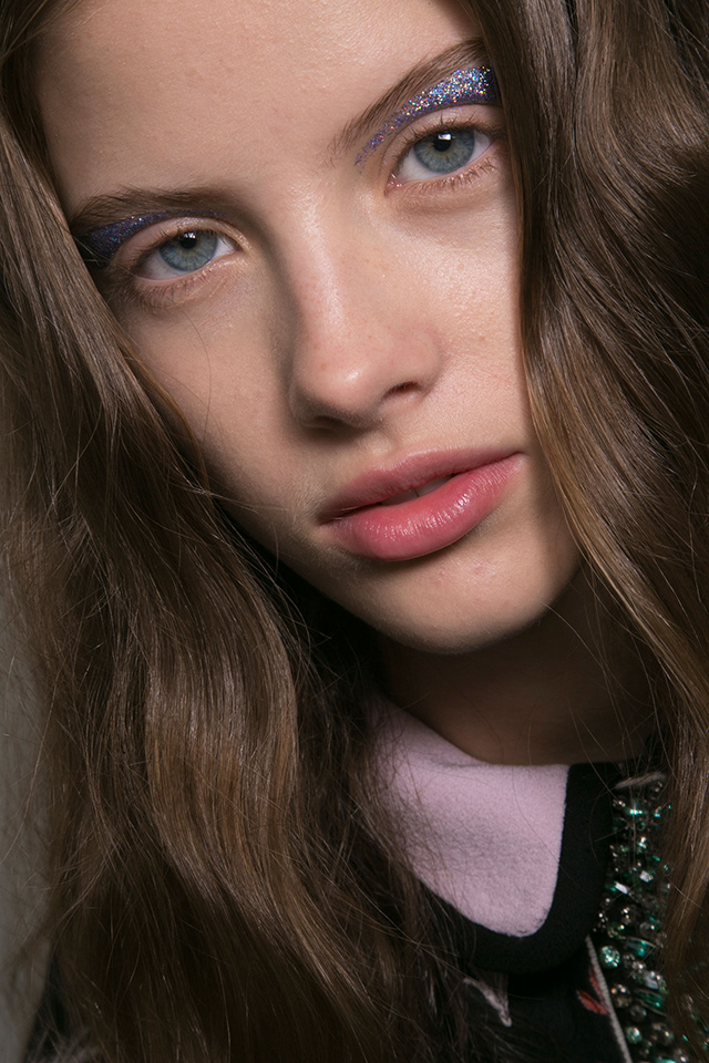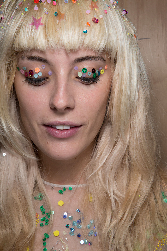 К летящим нарядам стилист Пол Хэнлон добавил будто бы наспех сделанные прически — легкие волны и полураспущенные косы. А вот где была настоящая фантазия, так это в макияже, созданном Вэл Гарланд. Она нанесла разноцветный глиттер прямо под брови на специальный Mixing Medium Eyeliner от M. A. C.