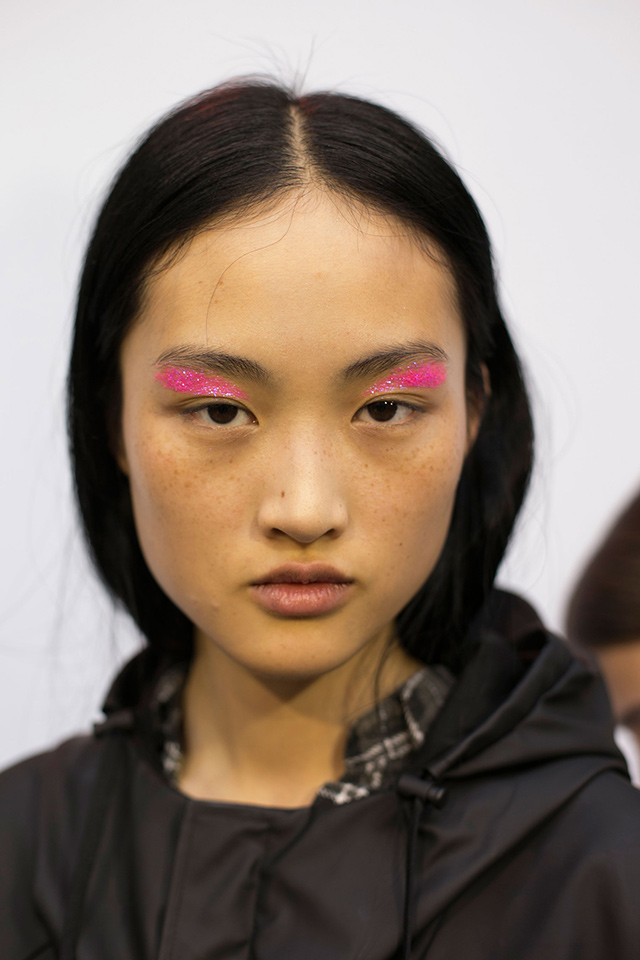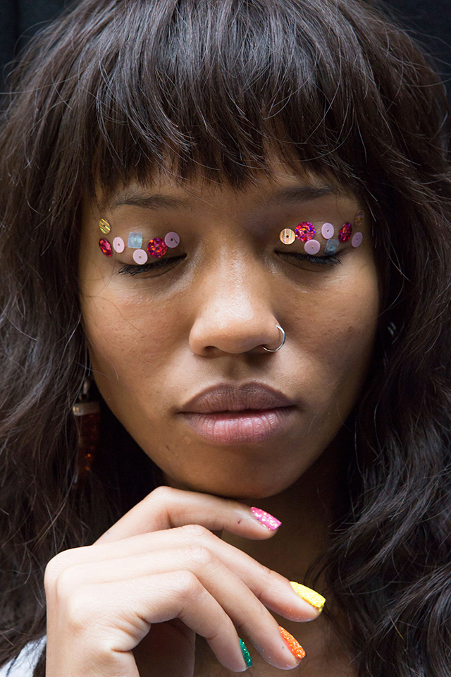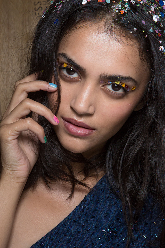 Разноцветные пайетки вместо теней, натуральная кожа, выделенные брови и слегка уложенные волосы — именно такой образ придумали визажисты и стилисты показа Ashish, который идеально подойдет для вечеринки.