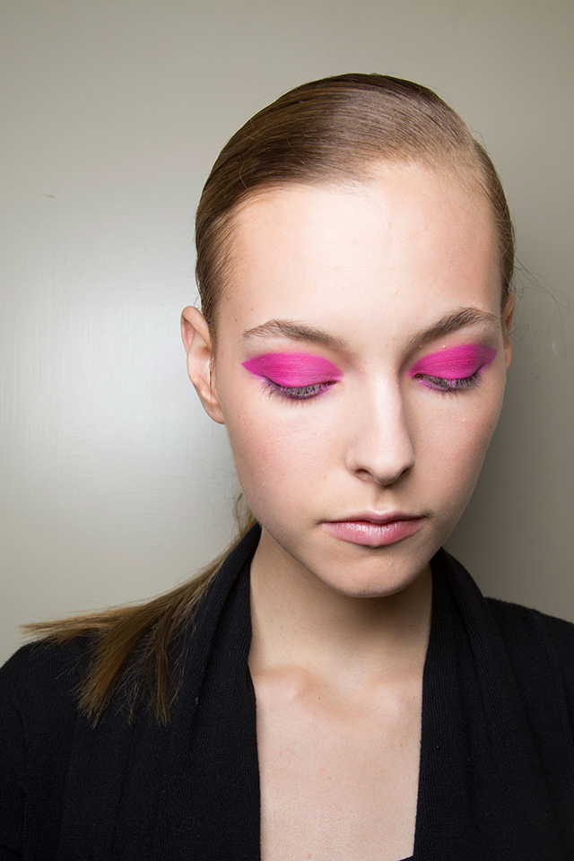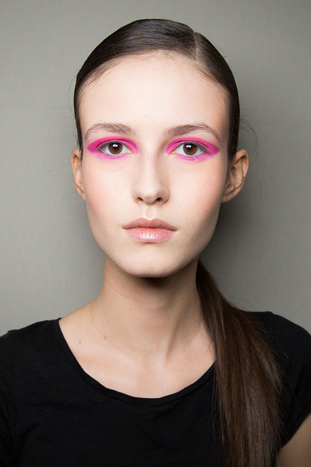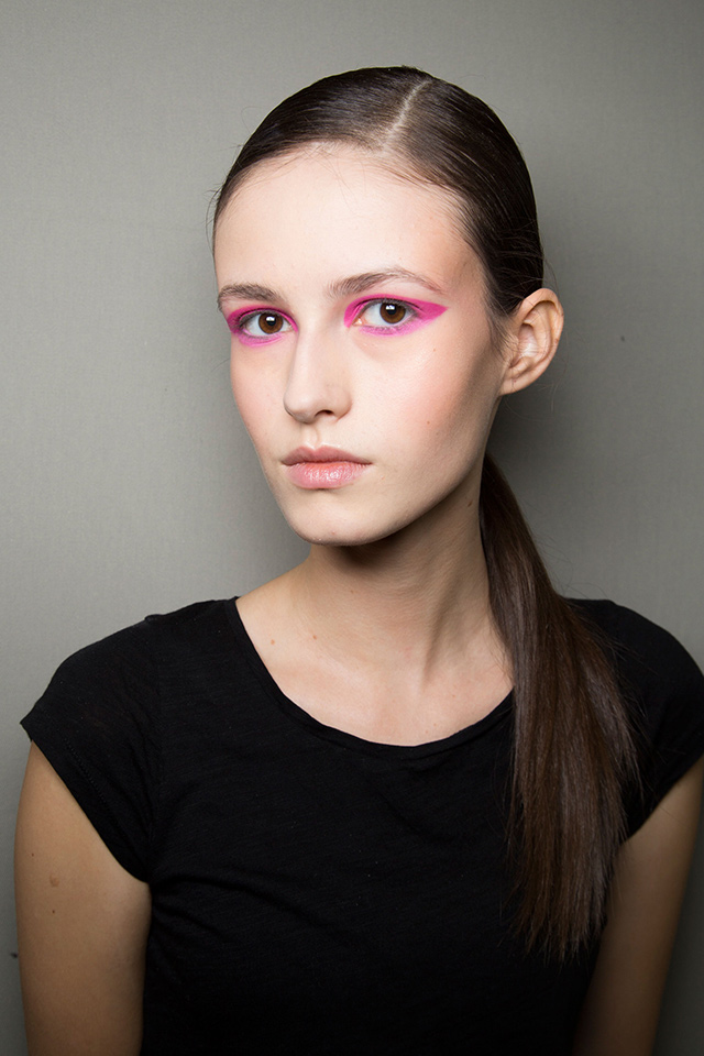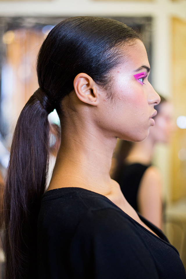 Идеально гладкие хвосты продолжают быть на пике популярности, да и в макияже несложно заметить главный и единственный акцент — ярко-розовые тени. Повторить такой макияж самостоятельно проще простого.