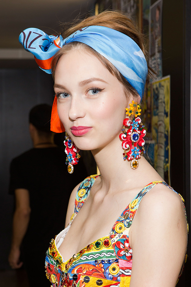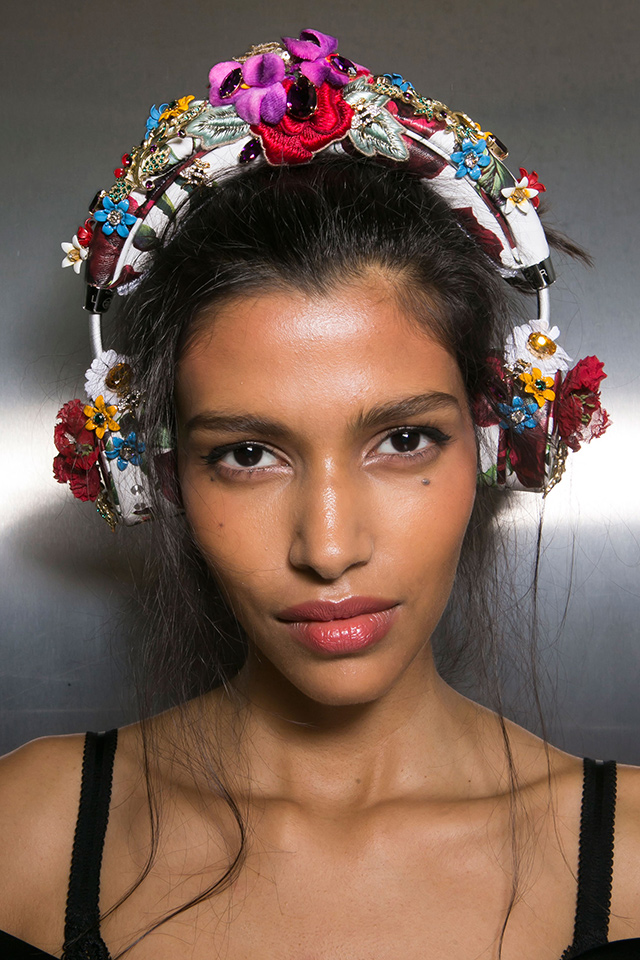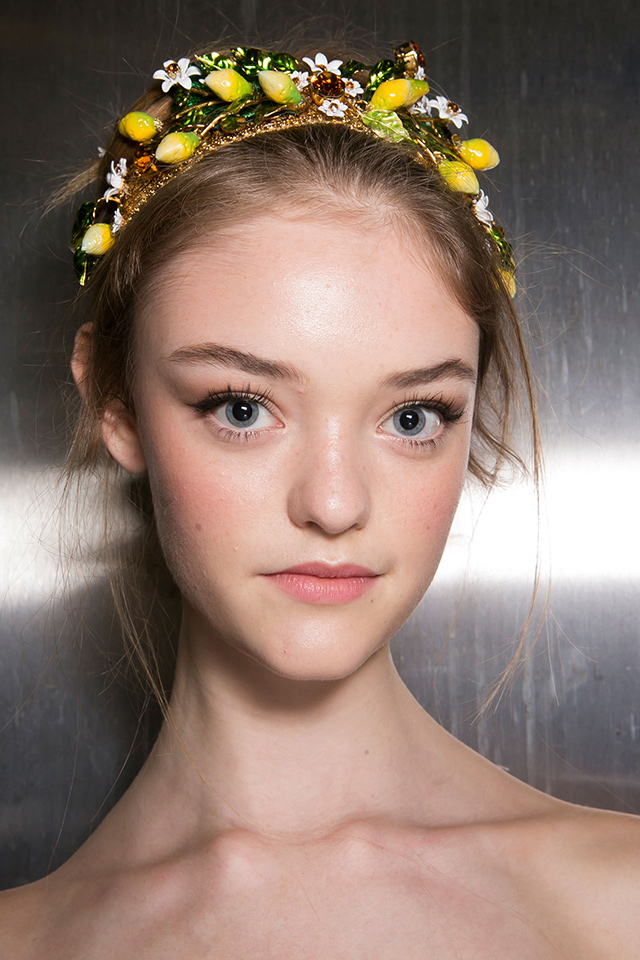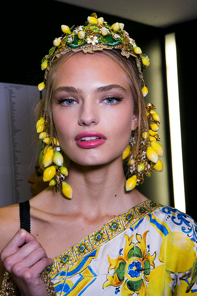 Все внимание гостей показа Dolce & Gabbana было приковано к головам моделей, украшенным ободками с цветами и фруктами. Яркие апельсины, лимоны, цветы стали олицетворением весны и лета. Женственный макияж вновь создавала Пэт МакГрат: кокетливо вздернутые стрелки с растушеванным уголком, розовые и алые губы и румянец.