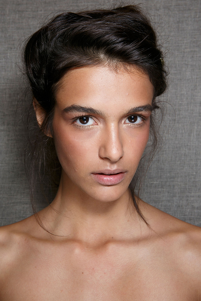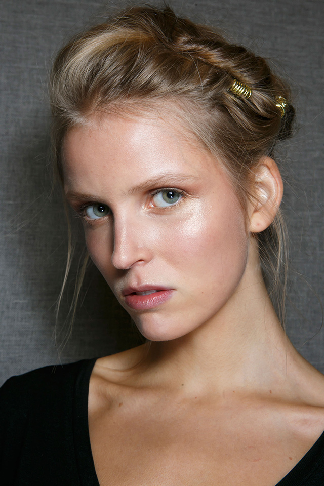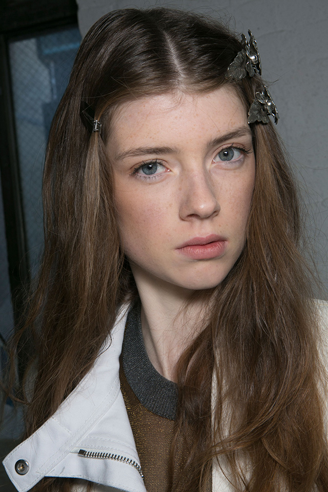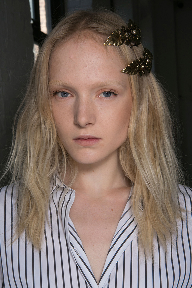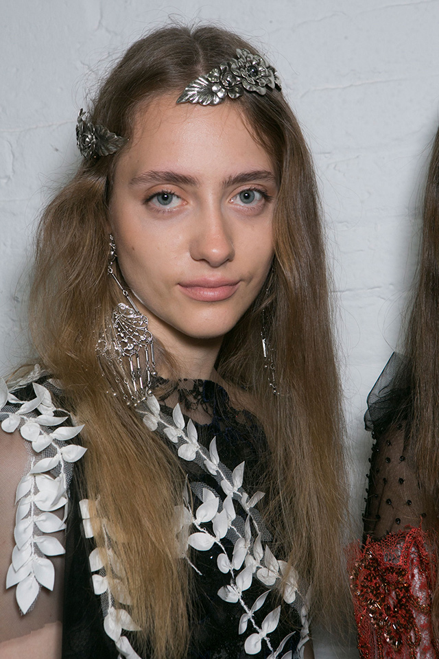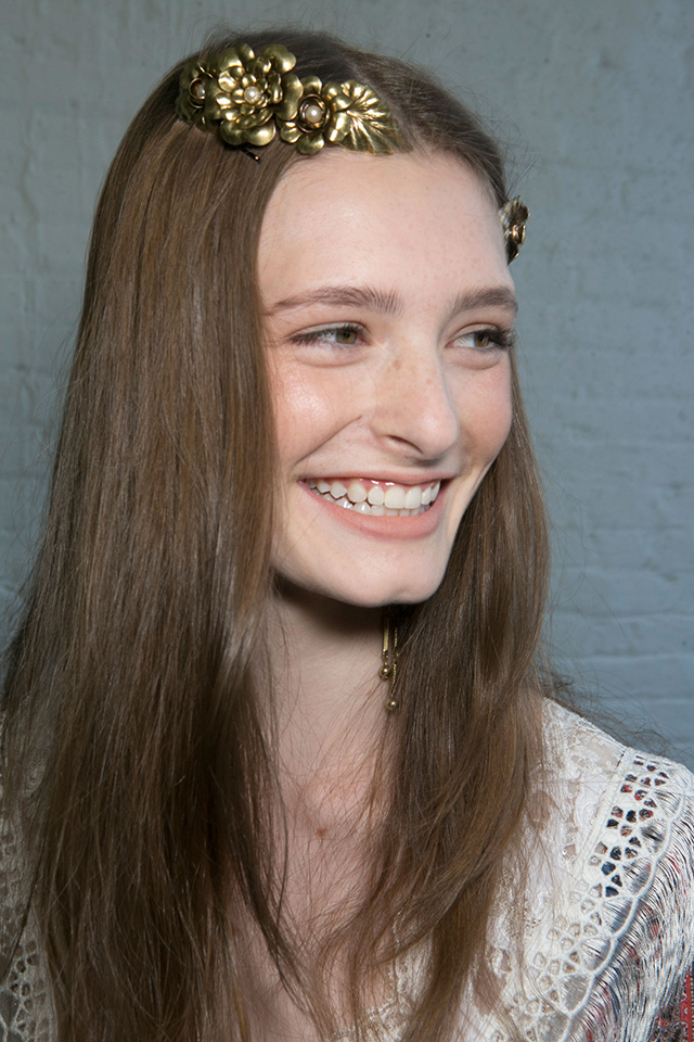 Когда коллекция перенасыщена кружевом, бархатом, блестящими деталями и глиттером, то идеальным макияжем станет его отсутствие. Почти так и поступил визажист Джеймс Калиардос, который сотворил едва заметный макияж в персиковом цвете. Наше внимание привлекли лишь красивые металлические заколки из цветов.