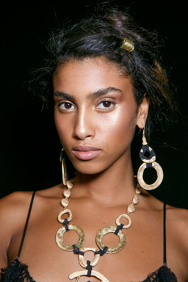 На показе Alberta Ferretti лица моделей сияли бронзовыми и золотыми оттенками. Для создания такого эффекта Шарлотте Тилбери понадобились бронзирующая пудра, хайлайтер, а также перламутровые пигменты. Визажист не пожалела и румян розово-абрикосового оттенка. Законченность образу придали прически, созданные из слабо скрученных в жгуты прядей, которые украсили золотые нити.