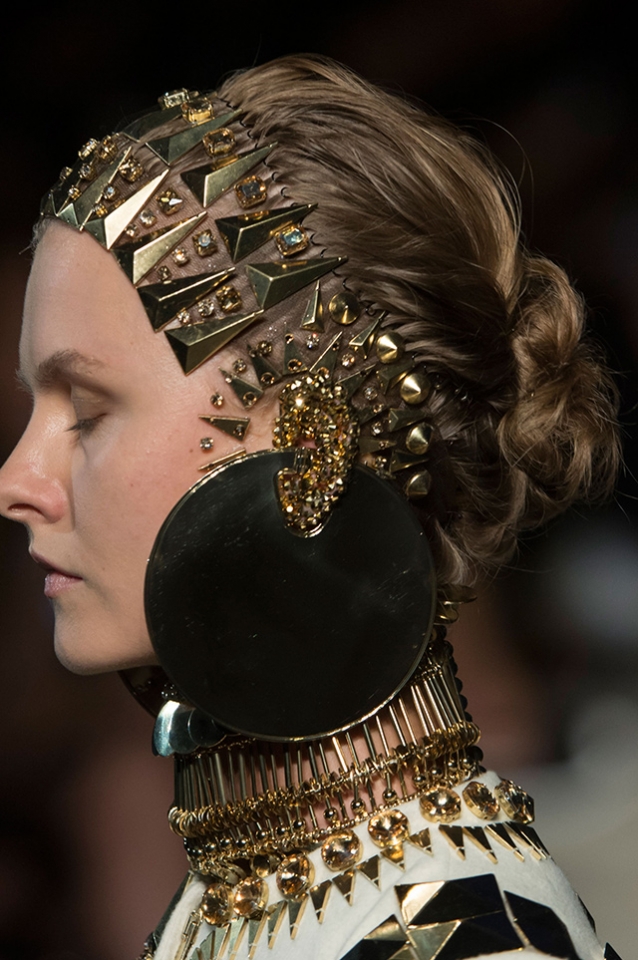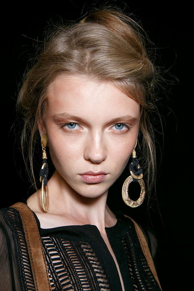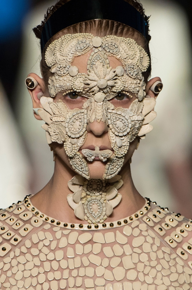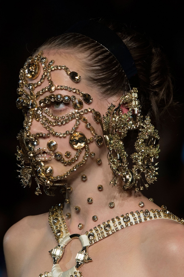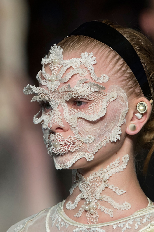 Рикардо Тиши не первый раз украшает лица моделей камнями, жемчугом и кружевом. Волосы разделены на прямой пробор и убраны назад. У тех моделей, что вышли на подиум без «масок», минимум макияжа — безупречный тон лица и светло-коричневые тени для век.