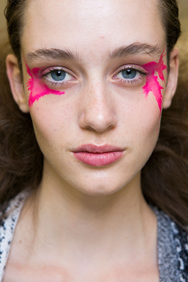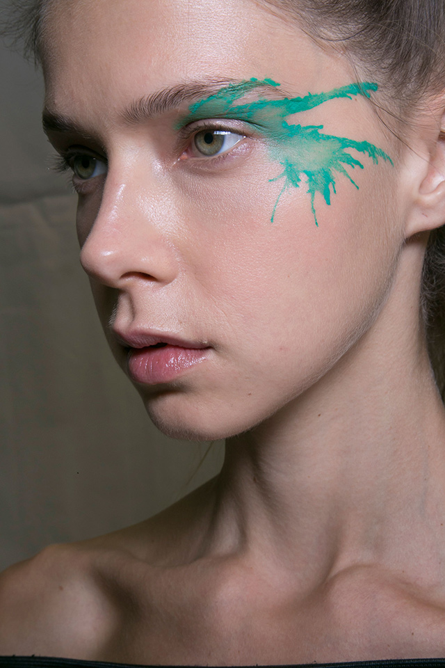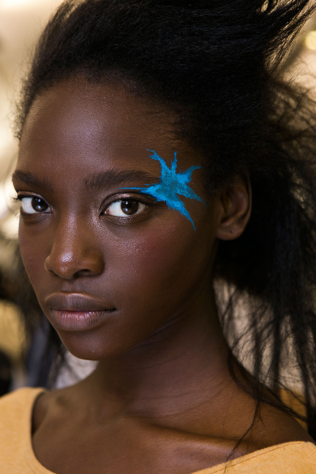Один из самых жизнерадостных бьюти-образов: на моделей будто случайно попали брызги красок. Разноцветные кляксы желтых, оранжевых, бирюзовых и розовых цветов украшали виски девушек.