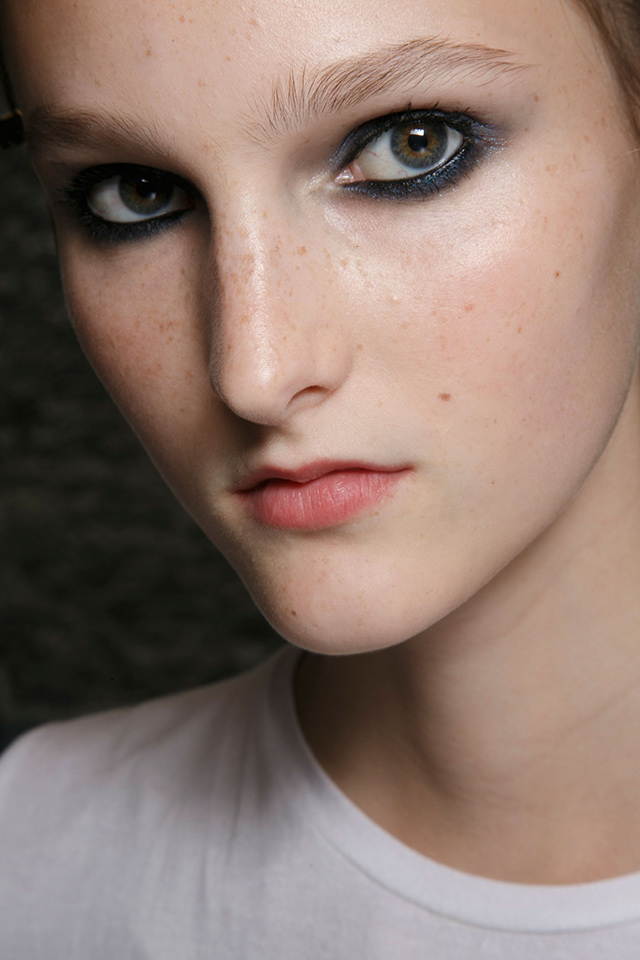 Золотистый тон кожи, сине-черный мерцающий smoky eyes и естественные губы — образ с показа Sonia Rykiel никогда не выйдет из моды.