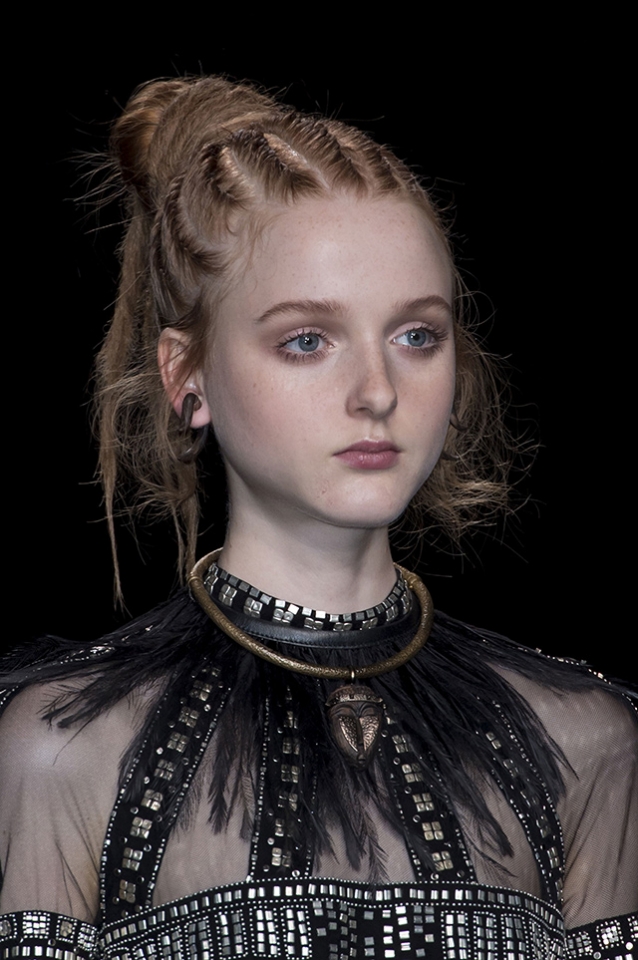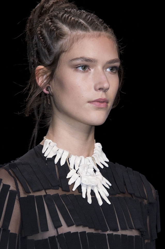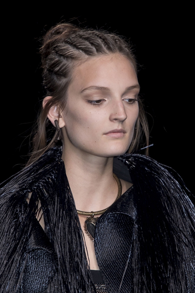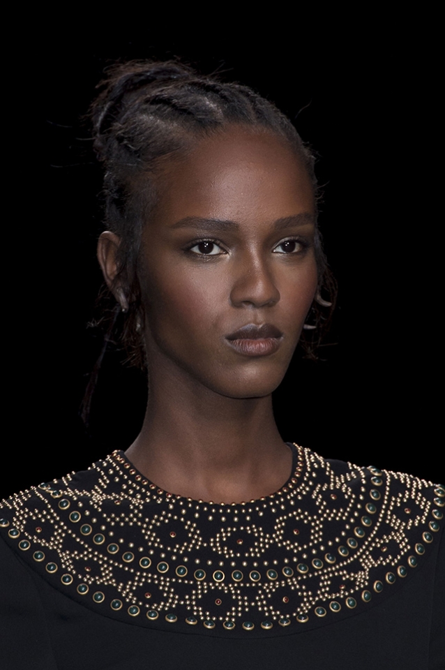Традиционный богемный образ моделей на показах Valentino сменился в этот раз легкой этникой. Вместо длинных распущенных волос были африканские косы, похожие на дреды. Их концы Гвидо Палау собрал в небрежный пучок. В макияже были идеально расставлены акценты: выделены скулы и глаза.